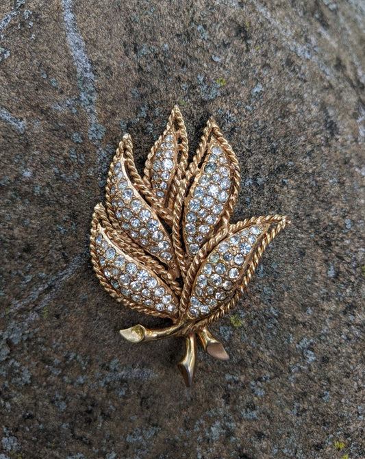 Vintage Hattie Carnegie Gold-Tone Leaf Brooch with Pavé Rhinestones | Mid-Century Designer Costume Pin