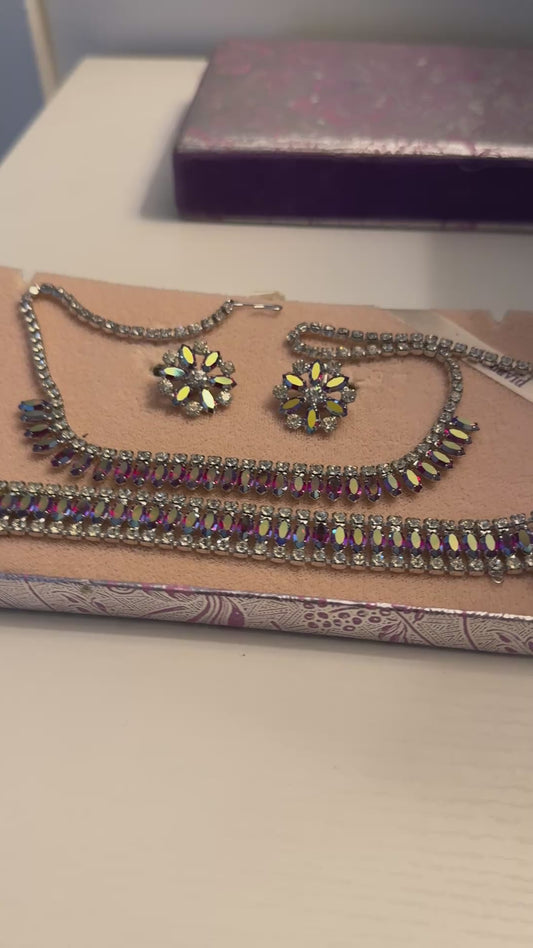 Vintage Style Guild Rhinestone Necklace Bracelet Earrings Set - 1950s Bib Parure Original Box
