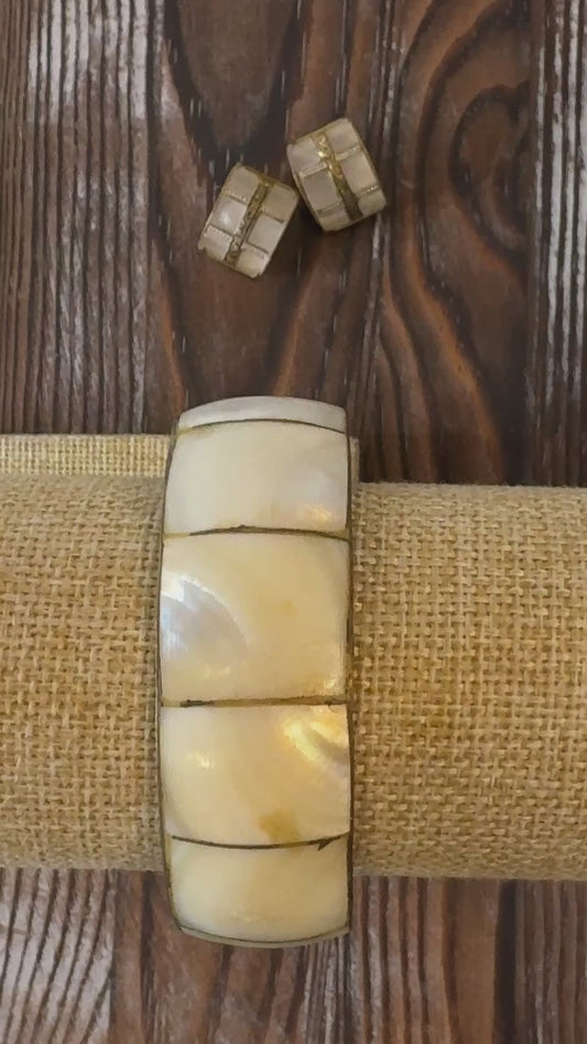 Vintage MOP Mother of Pearl Inlay Bangle Bracelet Clip Earrings Set Boho 70s