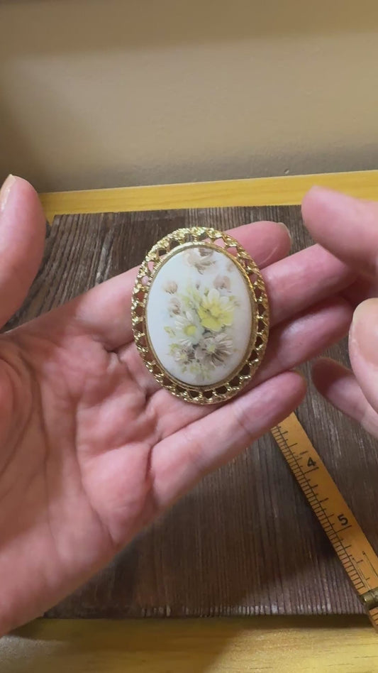 Vintage 1970s Hand-Painted Porcelain Floral Brooch