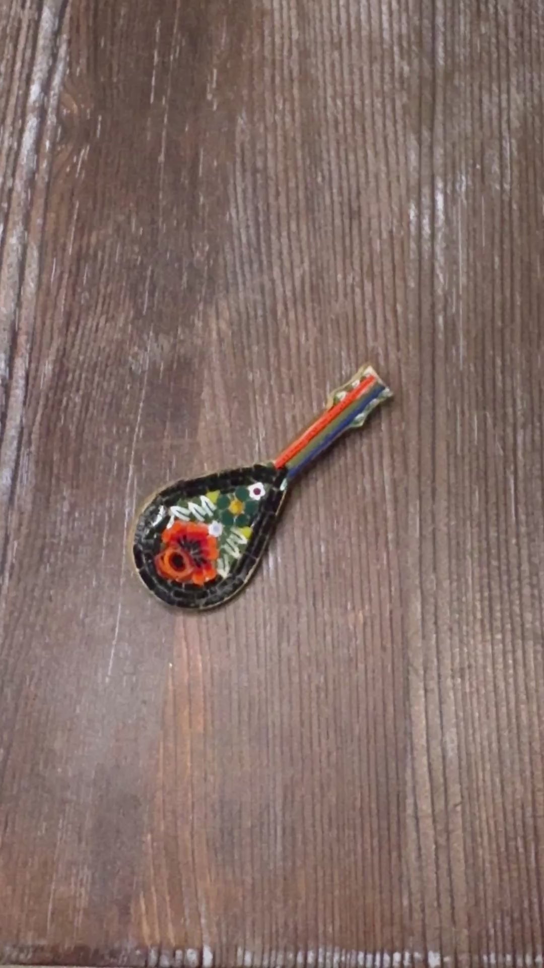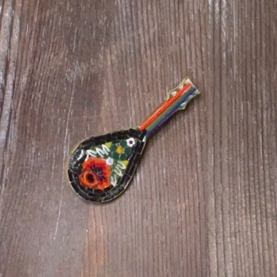 A mid-century Italian micro mosaic brooch shaped like a mandolin. Intricate glass tesserae form a floral motif over a black background, set in brass with a simple pin clasp. Likely made in Italy as a souvenir piece during the 1950s.