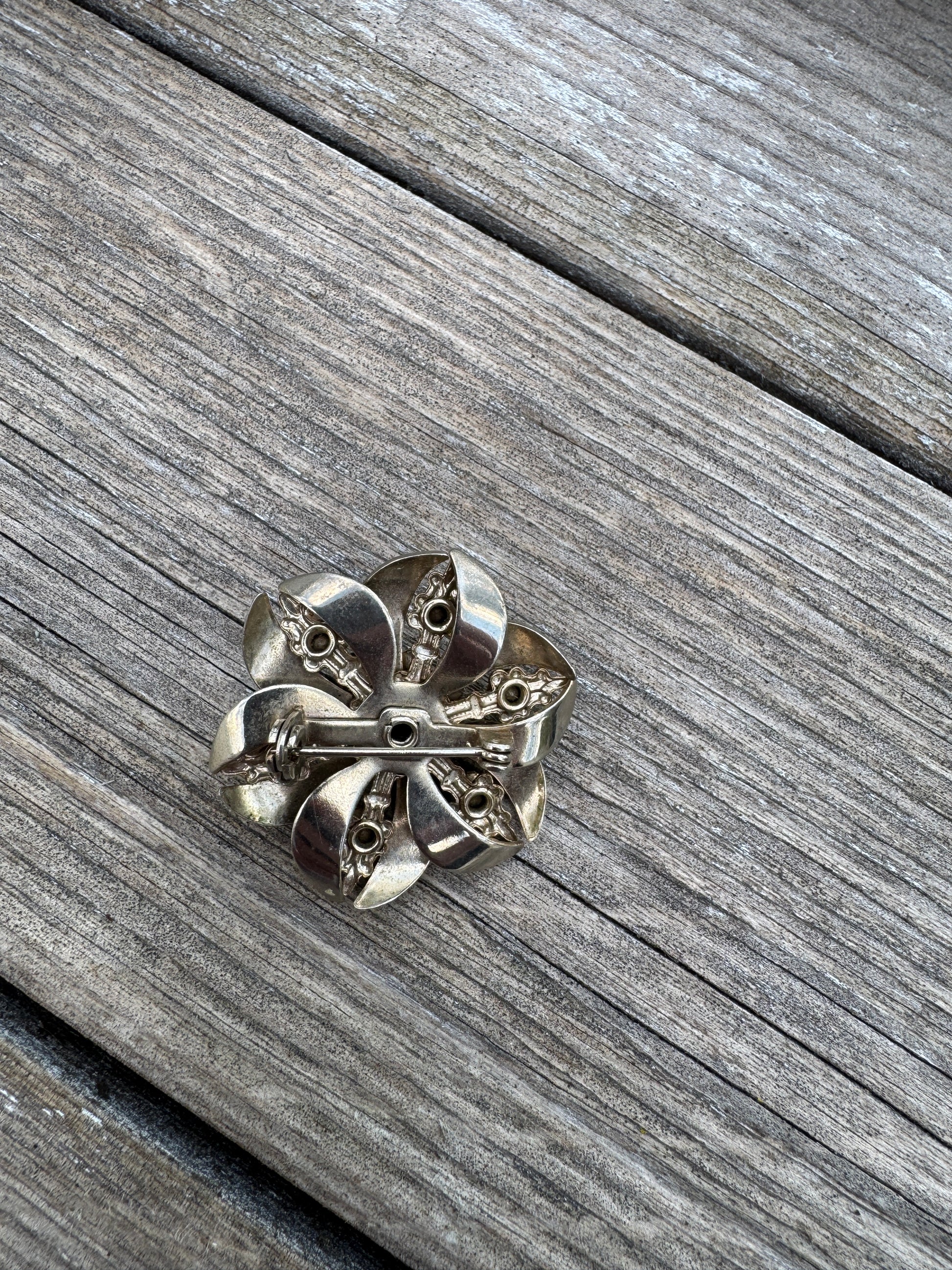 During the early 1940s, American designers like Coro and Boucher created dramatic, dimensional brooches using pot metal and rhinestones. These pieces often went unsigned when sold through department store contracts but exhibit the same craftsmanship and design vocabulary as their marked counterparts.