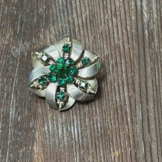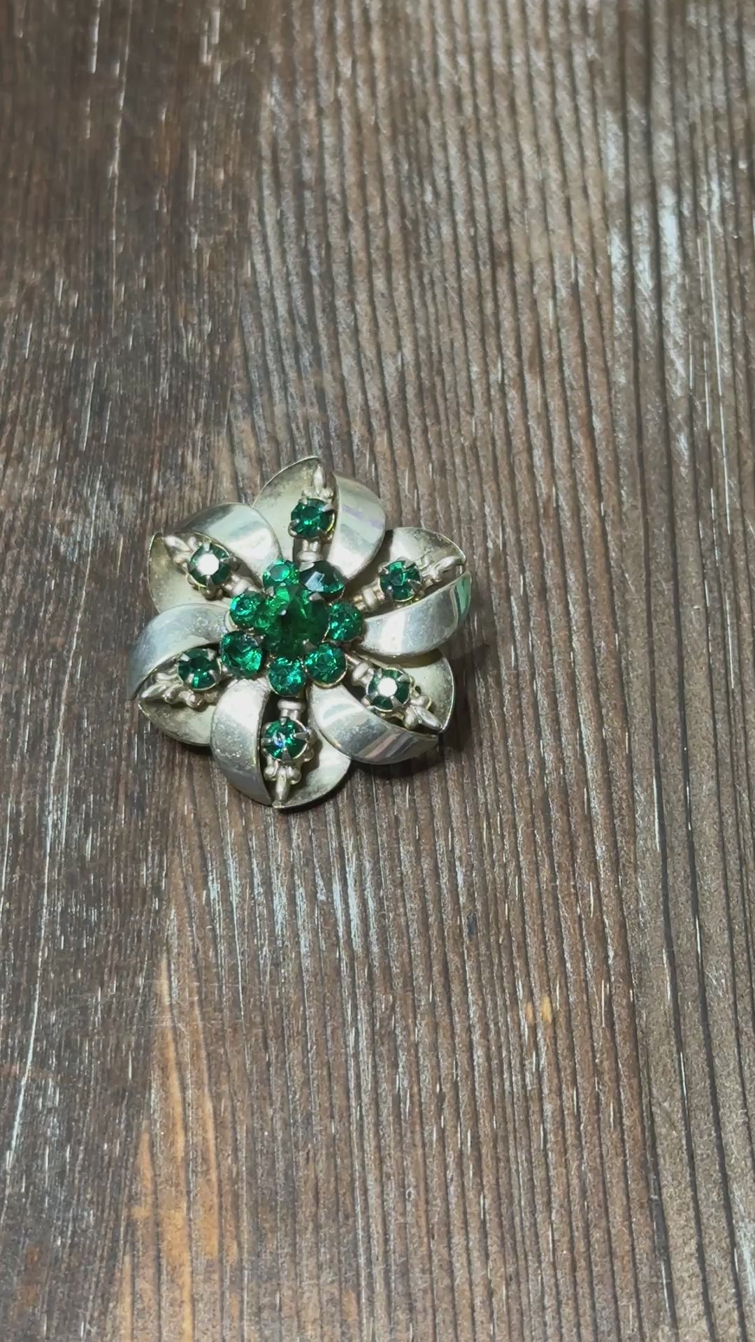 A luminous green rhinestone floral brooch from the 1940s. This unsigned piece features dimensional petals and brilliant emerald glass stones, set in a sculpted silver-tone setting with classic Retro Moderne styling. The craftsmanship and materials suggest early Coro or Boucher manufacture.