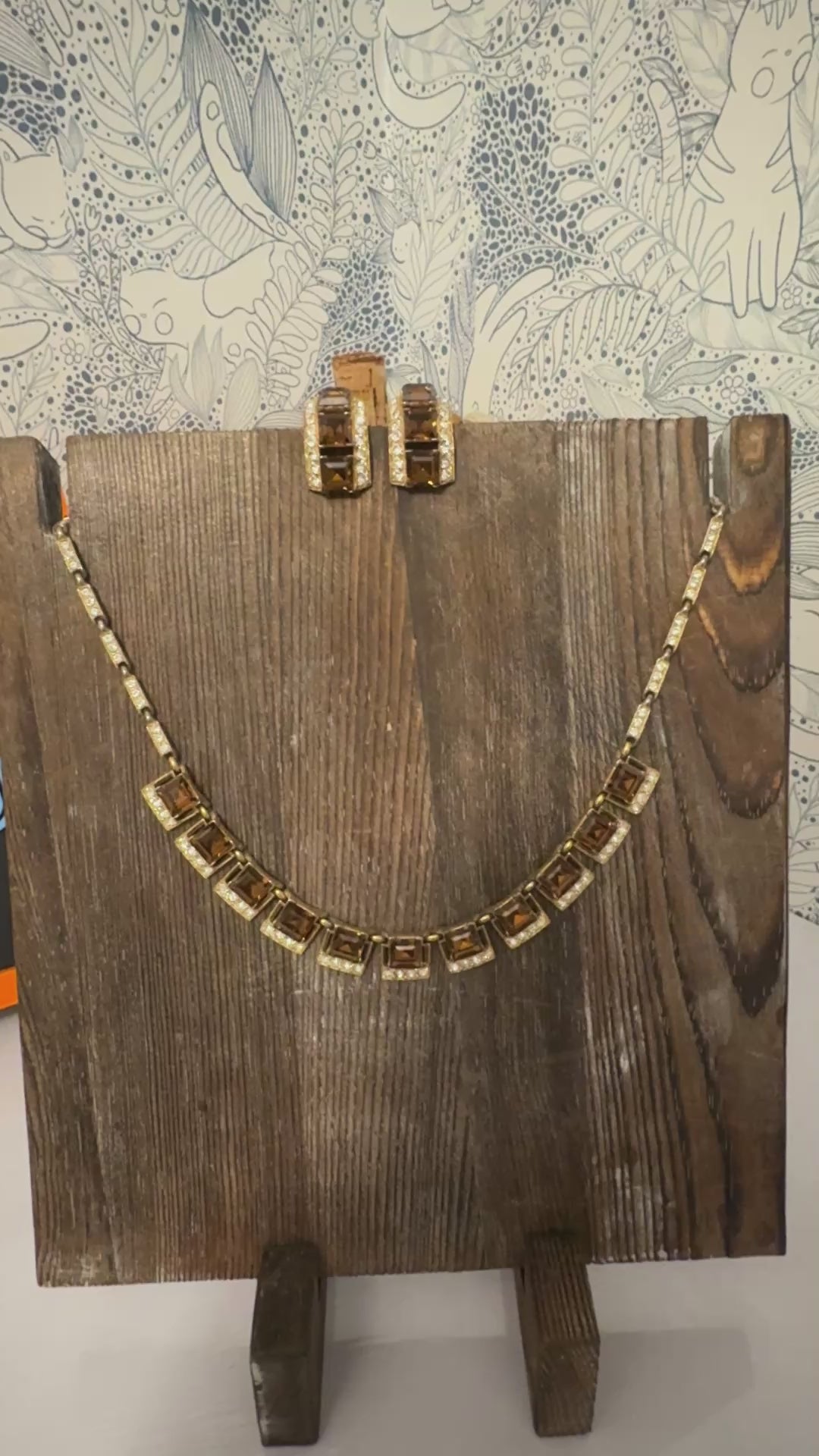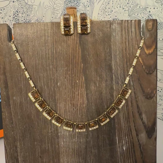 Vintage necklace in smoky topaz colors with clear rhinestone accent + matching earrings