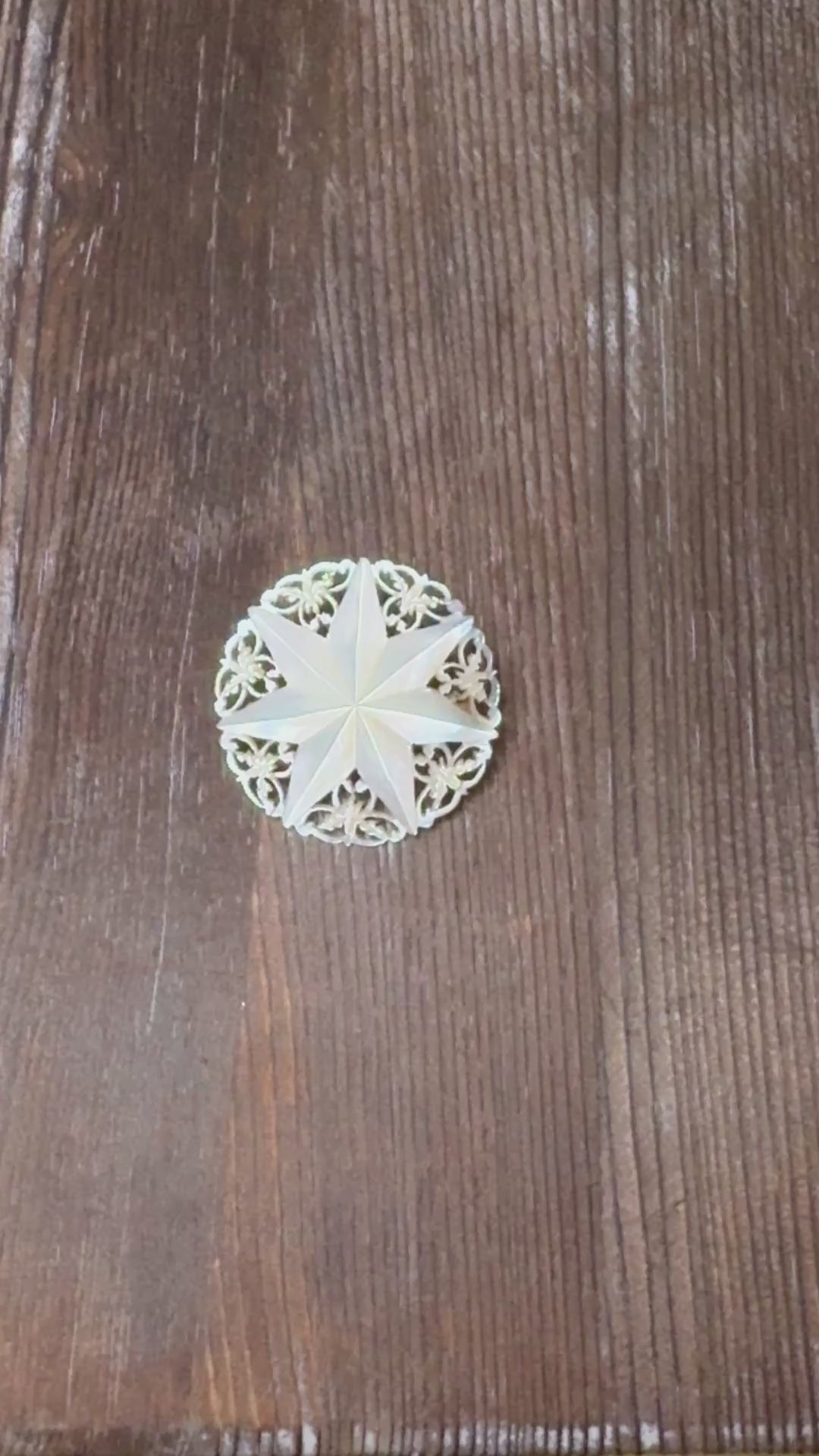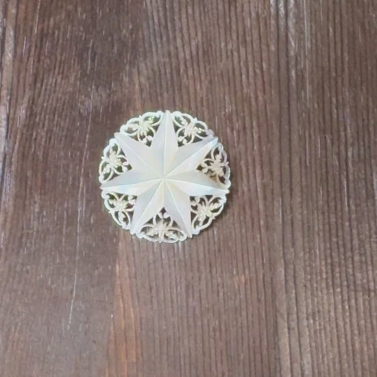 A hand-carved shell brooch with an eight-point star motif set over an openwork base. The natural shimmer and antique clasp design suggest early 1900s craftsmanship — a luminous example of mother-of-pearl artistry.