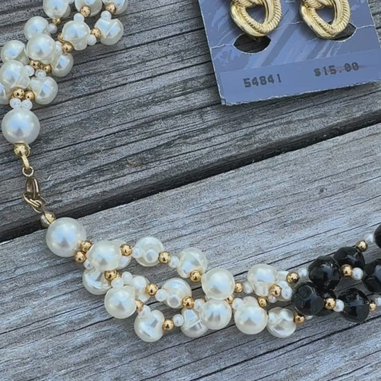 Vintage 1960s White & Black Beaded Necklace & Earrings Set