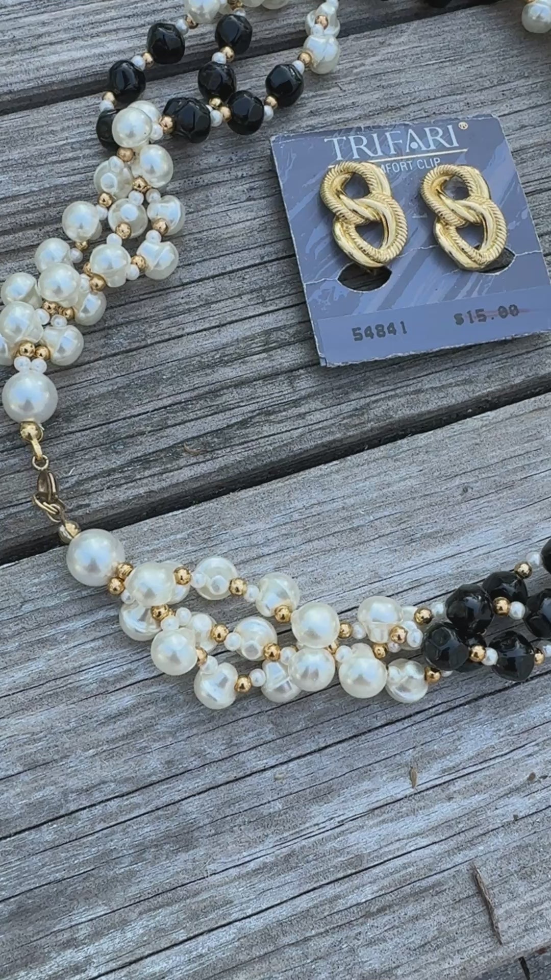 This vintage coordinated set includes a multi-strand necklace with white + black beads, and goldtone accents, plus Trifari knot-design earrings. In excellent vintage condition, it exemplifies Trifari’s craftsmanship and timeless style, perfect for adding elegance to any outfit.
