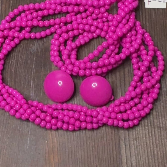 Hot Pink Multi-Strand Plastic Bead Necklace with Matching Clip Earrings