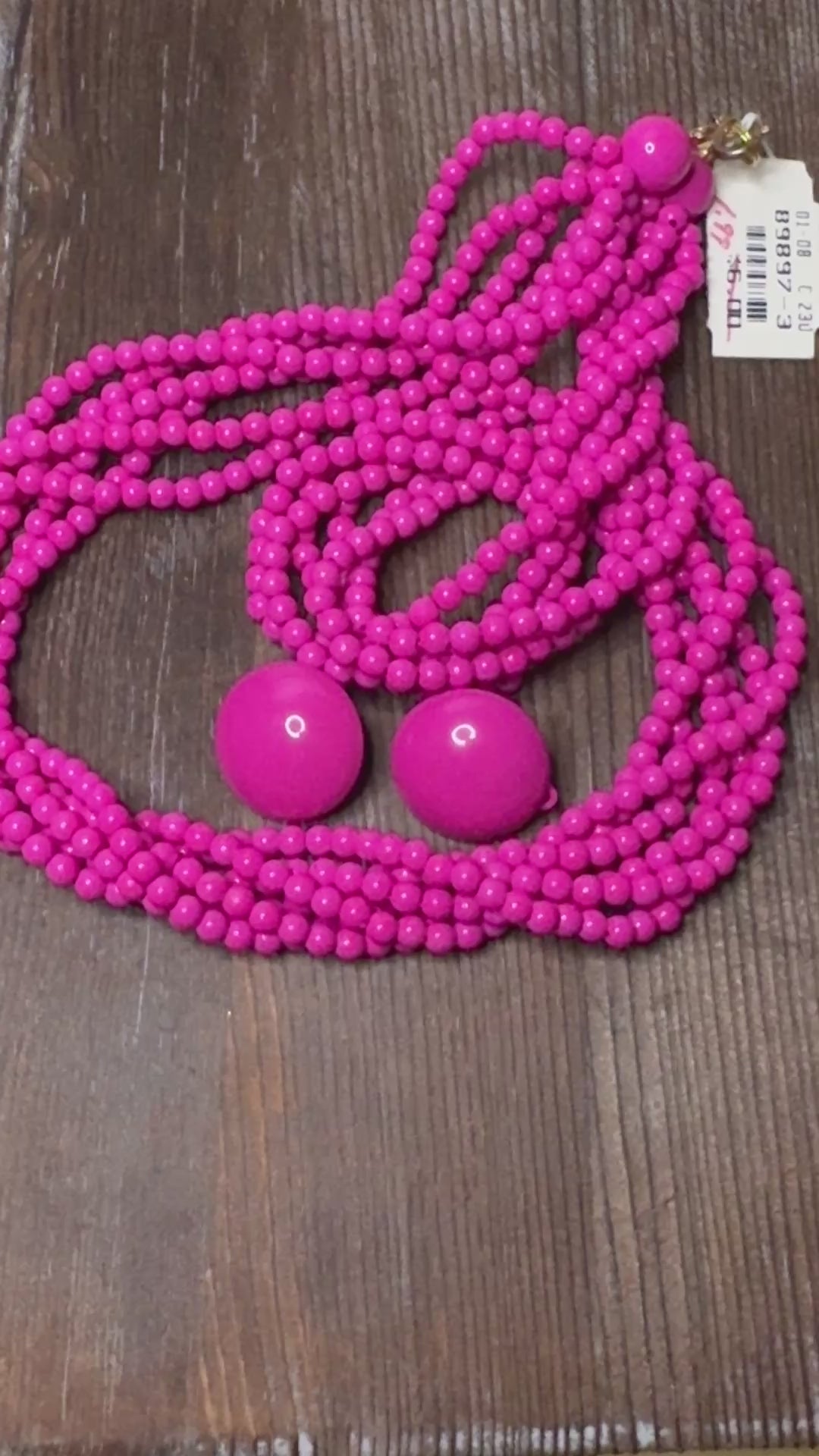 A bright pink multi-strand bead necklace with matching clip earrings — lightweight, retro, and full of personality. This fun mid-century set adds a perfect pop of color to any outfit