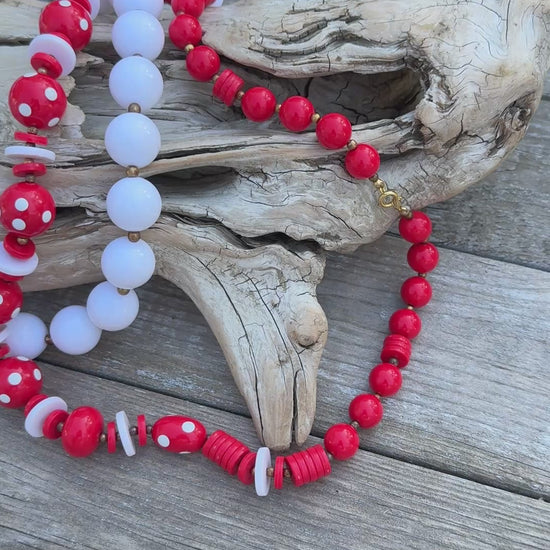 This coordinated vintage beaded necklace set showcases a red and white palette highlighted by delicate polka dot accents.
