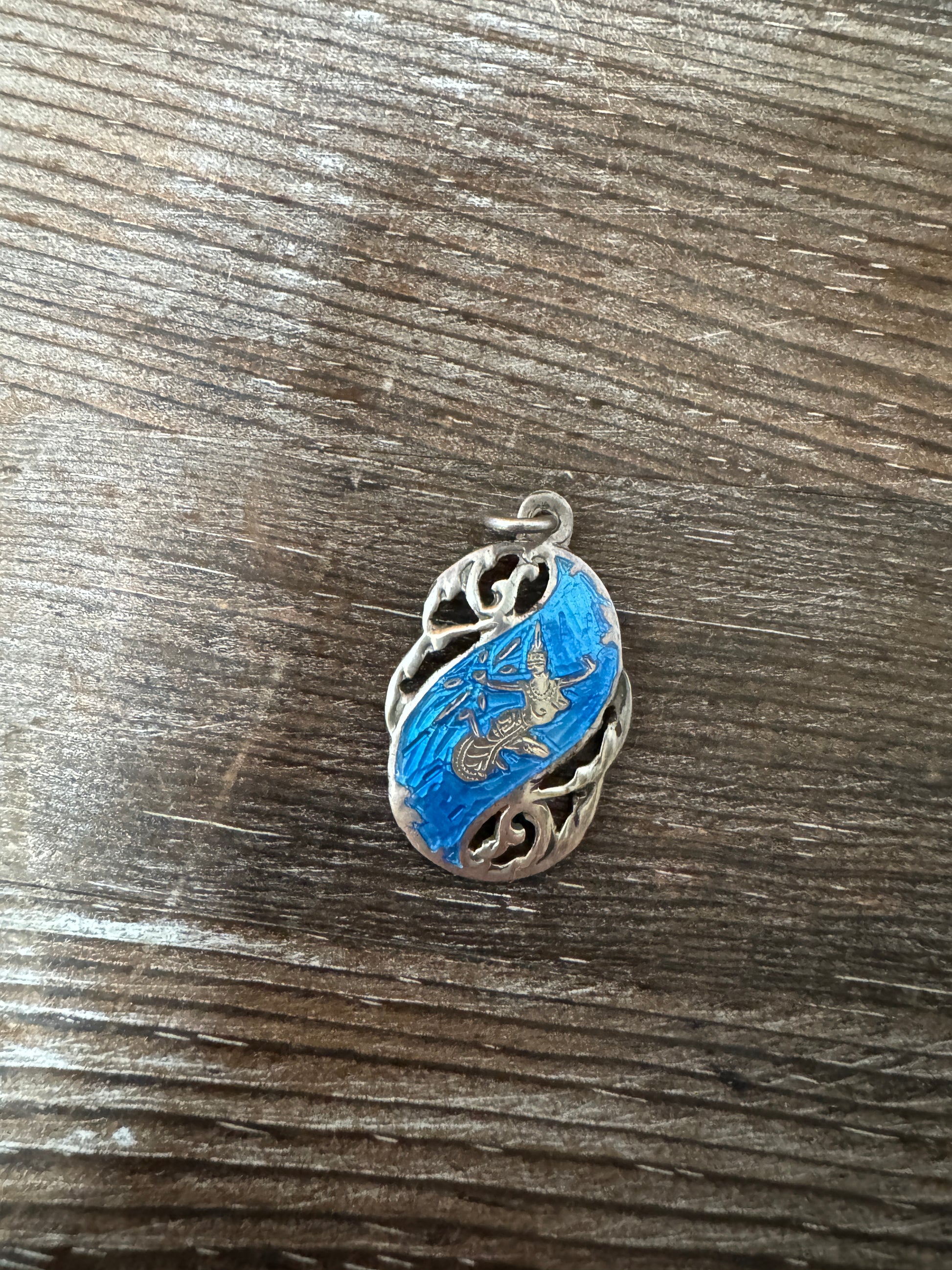 Step into the mystique of mid-century Siam with this stunning vintage sterling silver and blue enamel jewelry set, featuring a bracelet, matching earrings, and pendant. Each piece is hand-enameled with delicate silverwork depicting Mekkala, the Thai goddess of lightning, symbolizing power, grace, and protection.