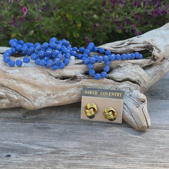 Add a touch of vintage charm with this blue beaded necklace and Sarah Coventry earrings. Featuring lightweight, smooth blue beads with golden details, it suits both casual and formal looks. Perfect for layering or wearing alone, this set brings timeless vintage elegance to your collection.