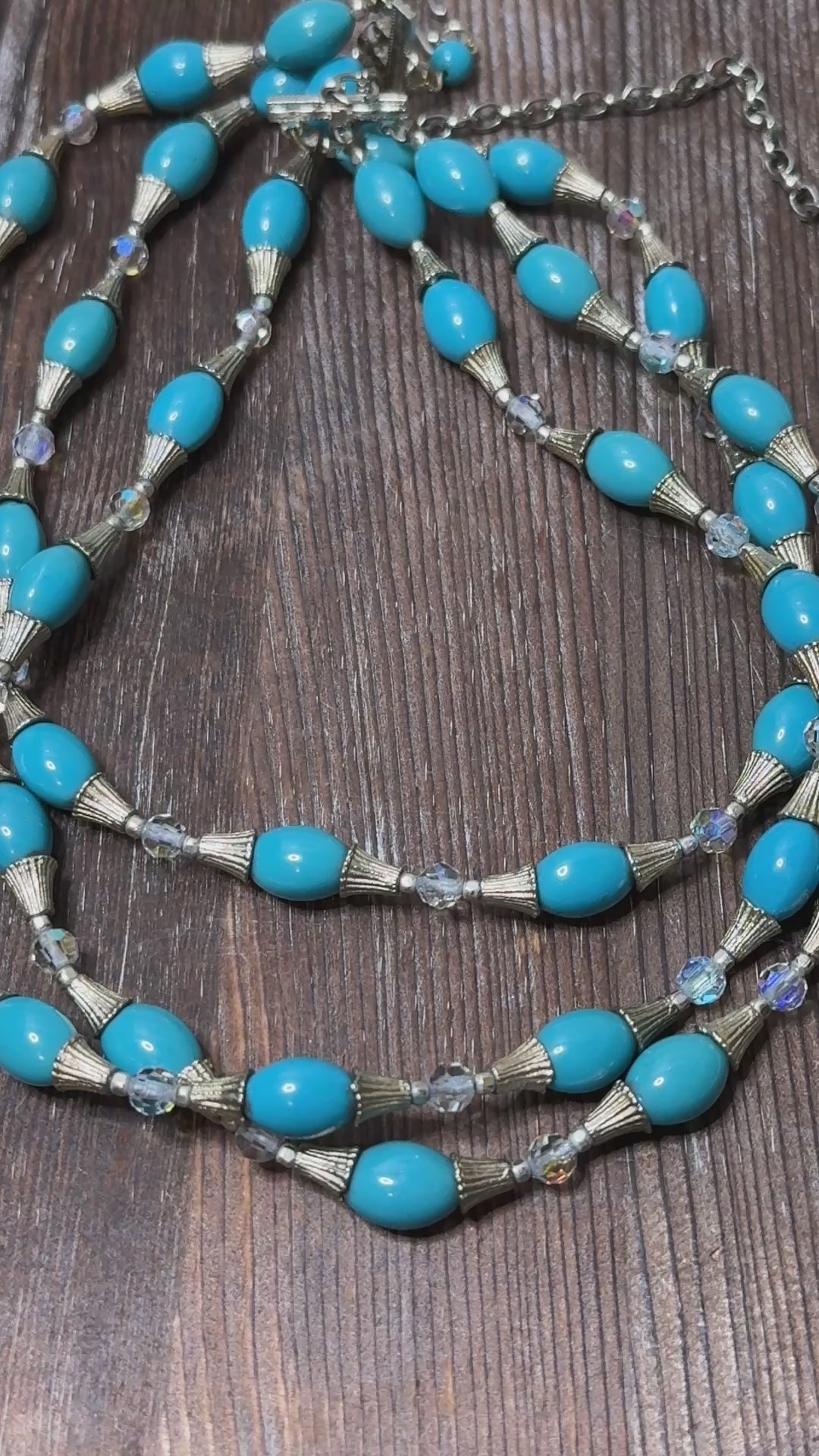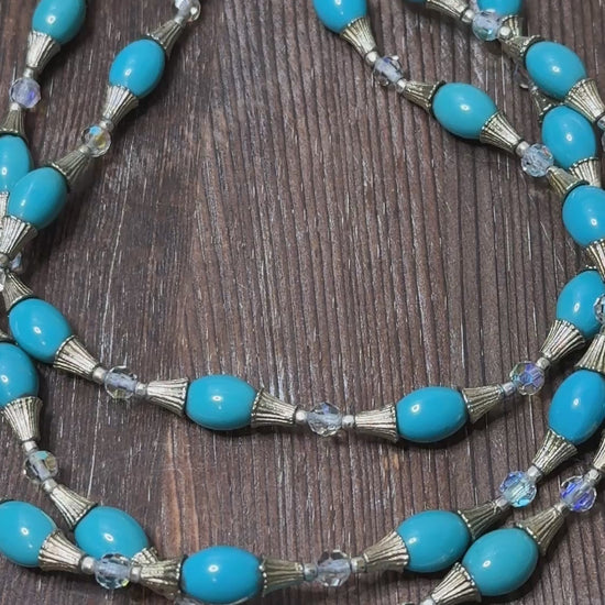 Unsigned triple-strand turquoise plastic necklace with aurora borealis crystal accents and gold-tone cones. Classic early 1960s design in the style of Lisner and Coro — bright, lightweight, and full of mid-century charm.