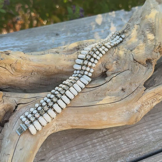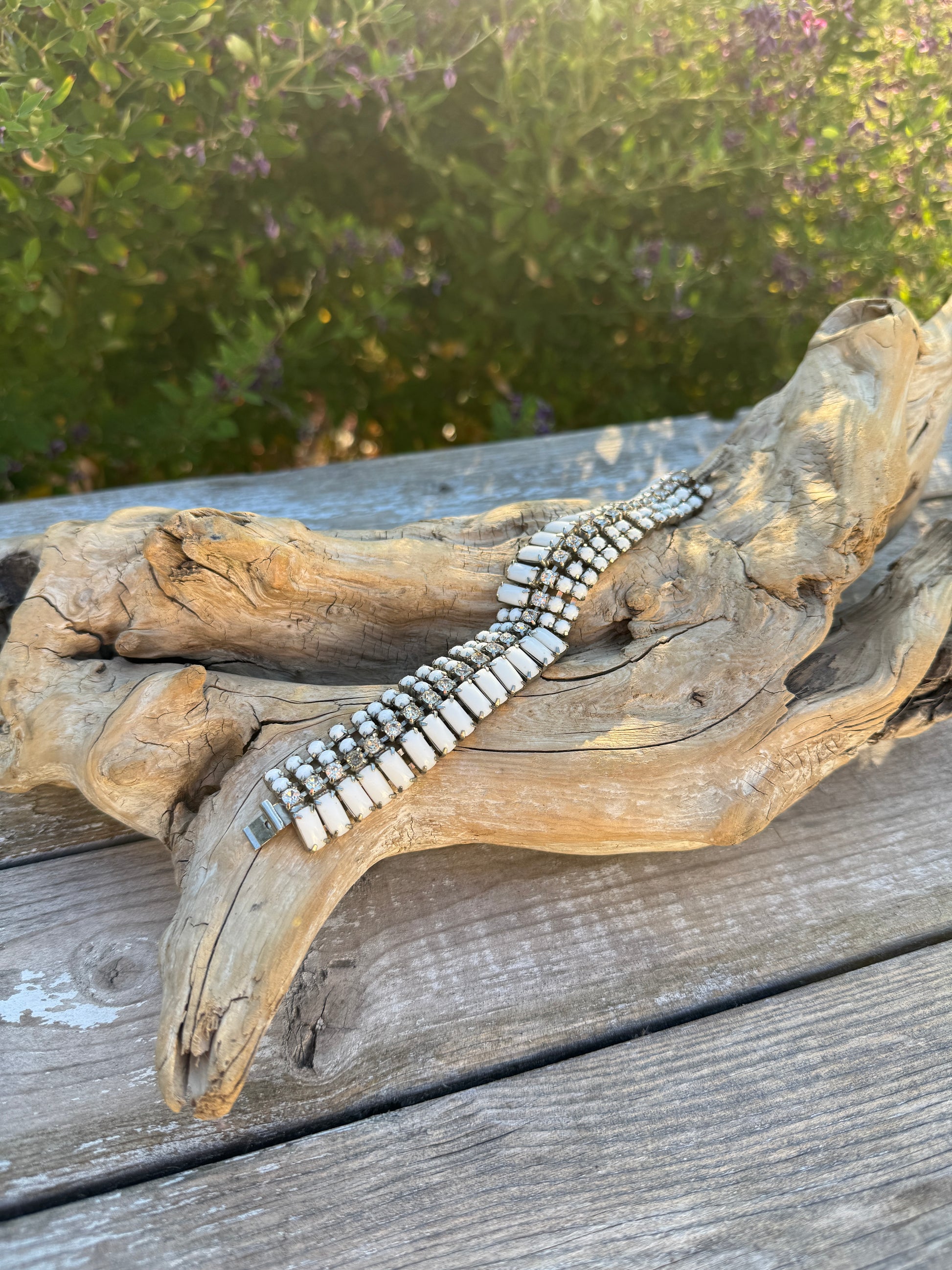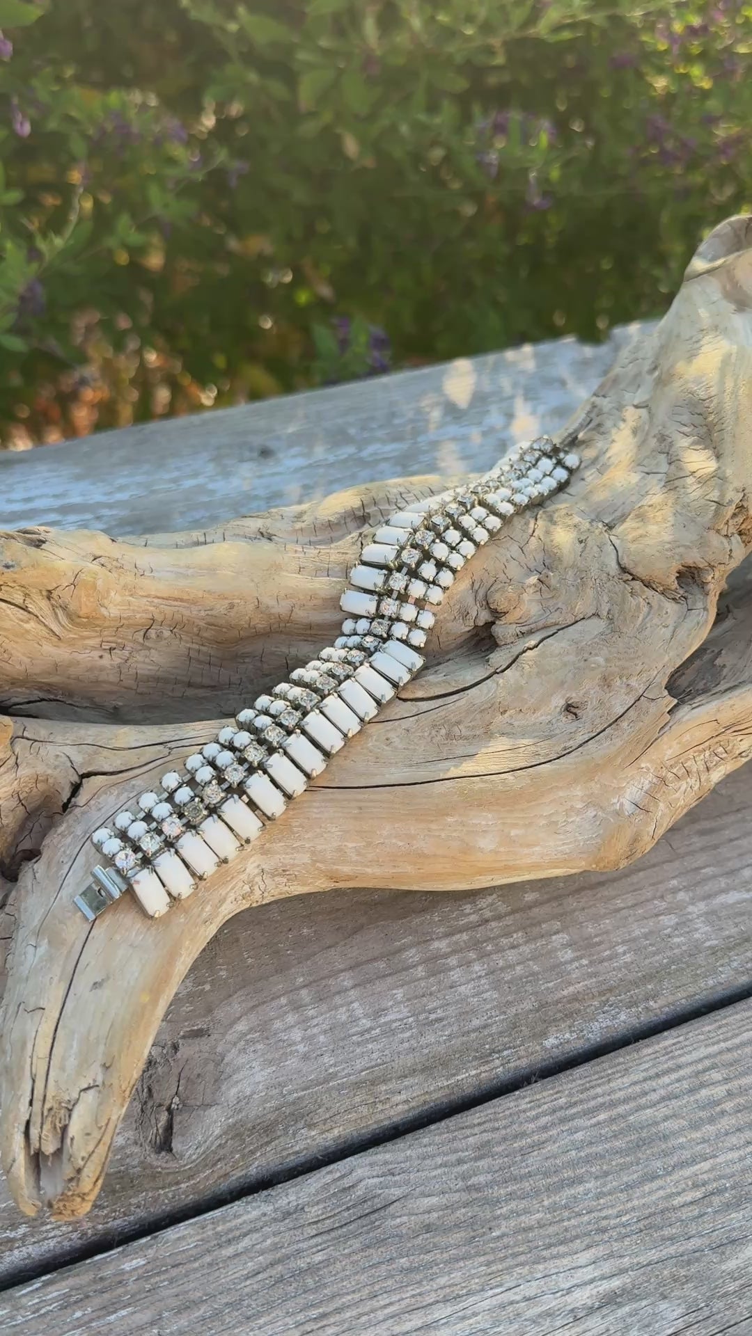 - Style: Multi-row link bracelet with alternating milk glass and rhinestone rows