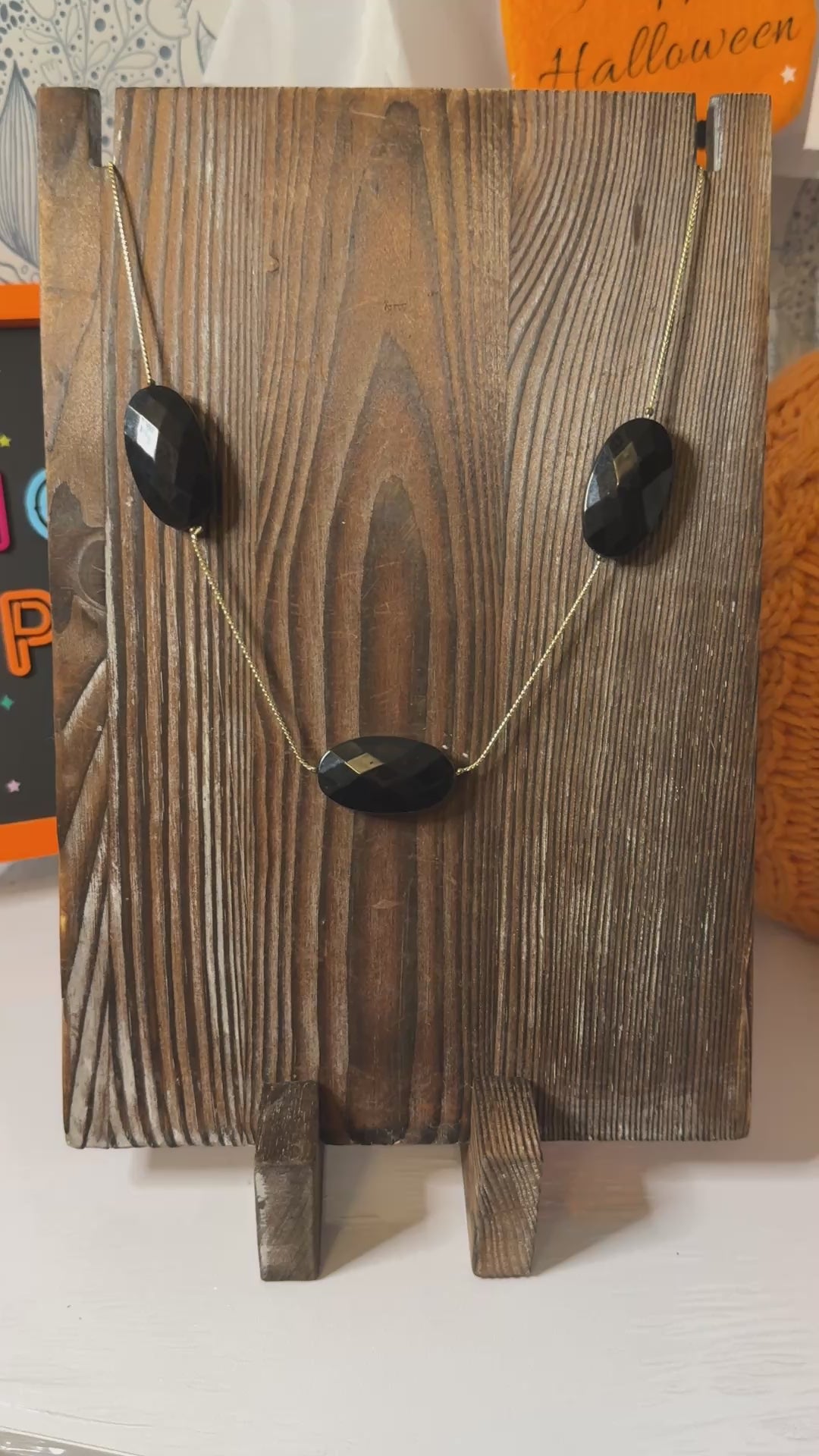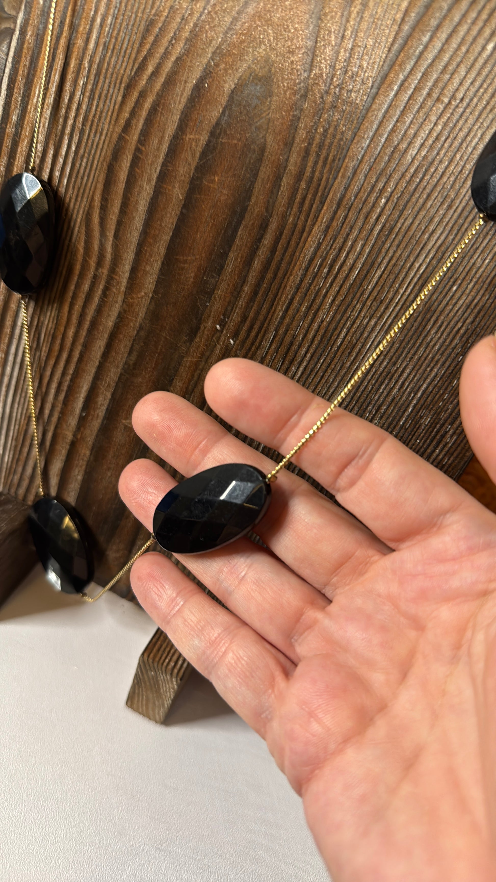 This bold vintage necklace from the 1970s features large oblong faceted black glass beads stationed on chain. Measuring 34 inches long, it can be worn doubled up for a choker effect or draped as a single strand for a sleek, sculptural look