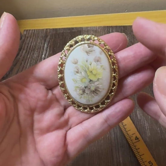 Vintage 1970s Hand-Painted Porcelain Floral Brooch