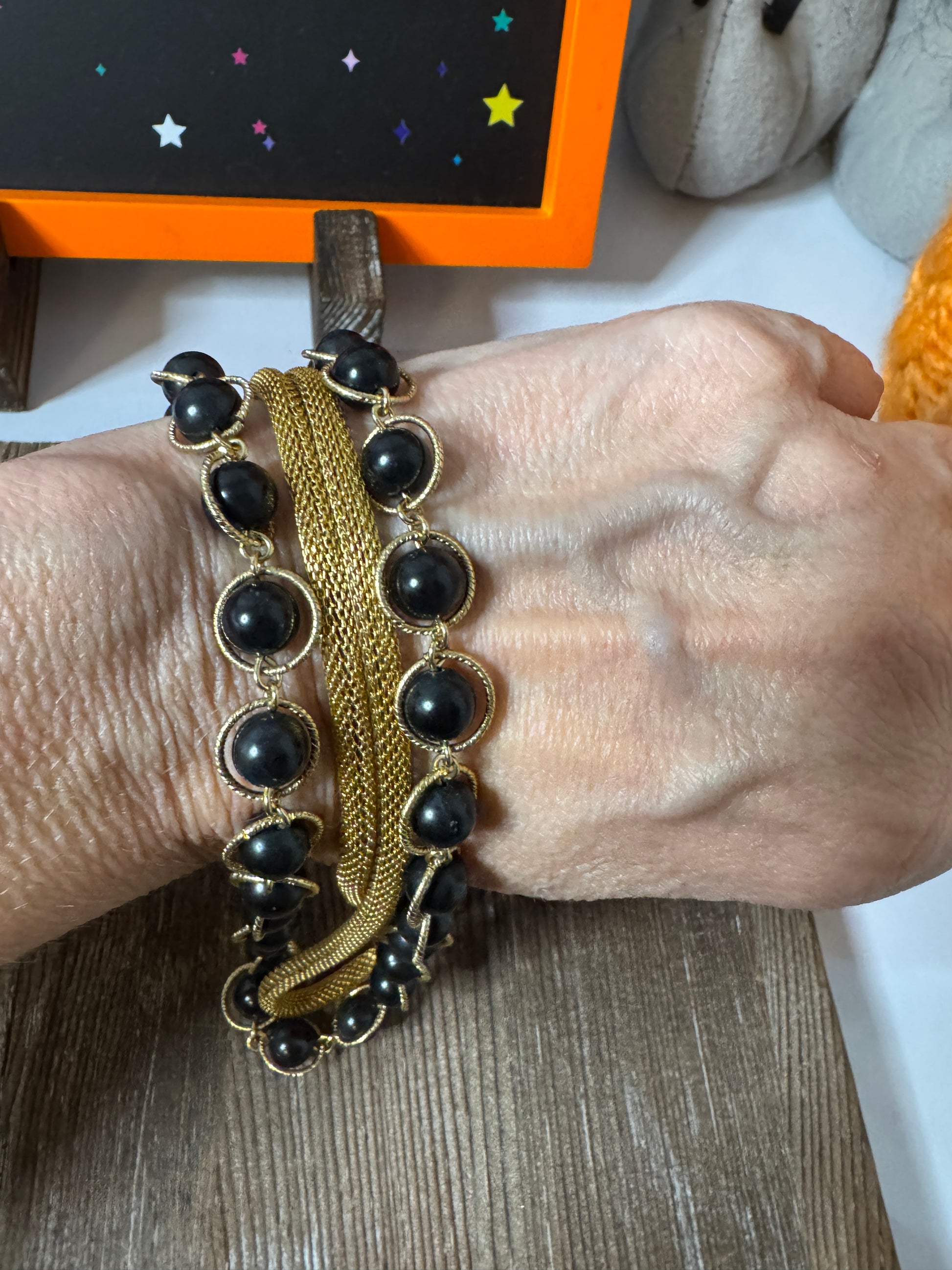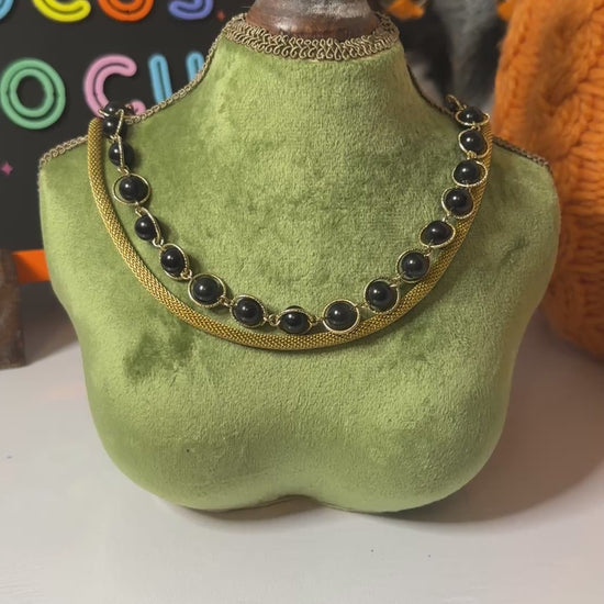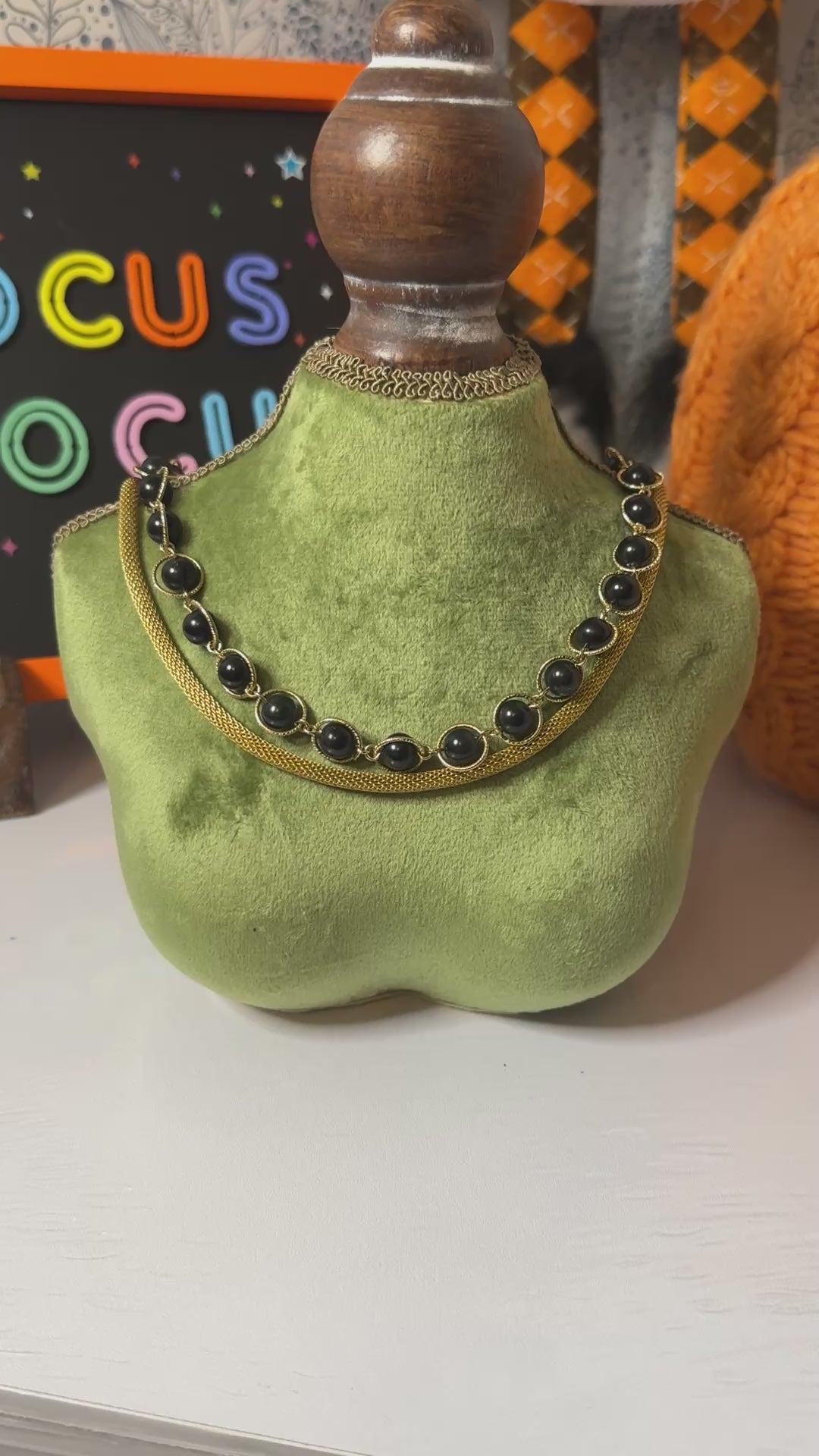 A vintage black bead and mesh collar necklace with gold-tone finish. Its mid-century design blends modern structure with soft shine — an elegant piece that transitions from day to evening effortlessly.