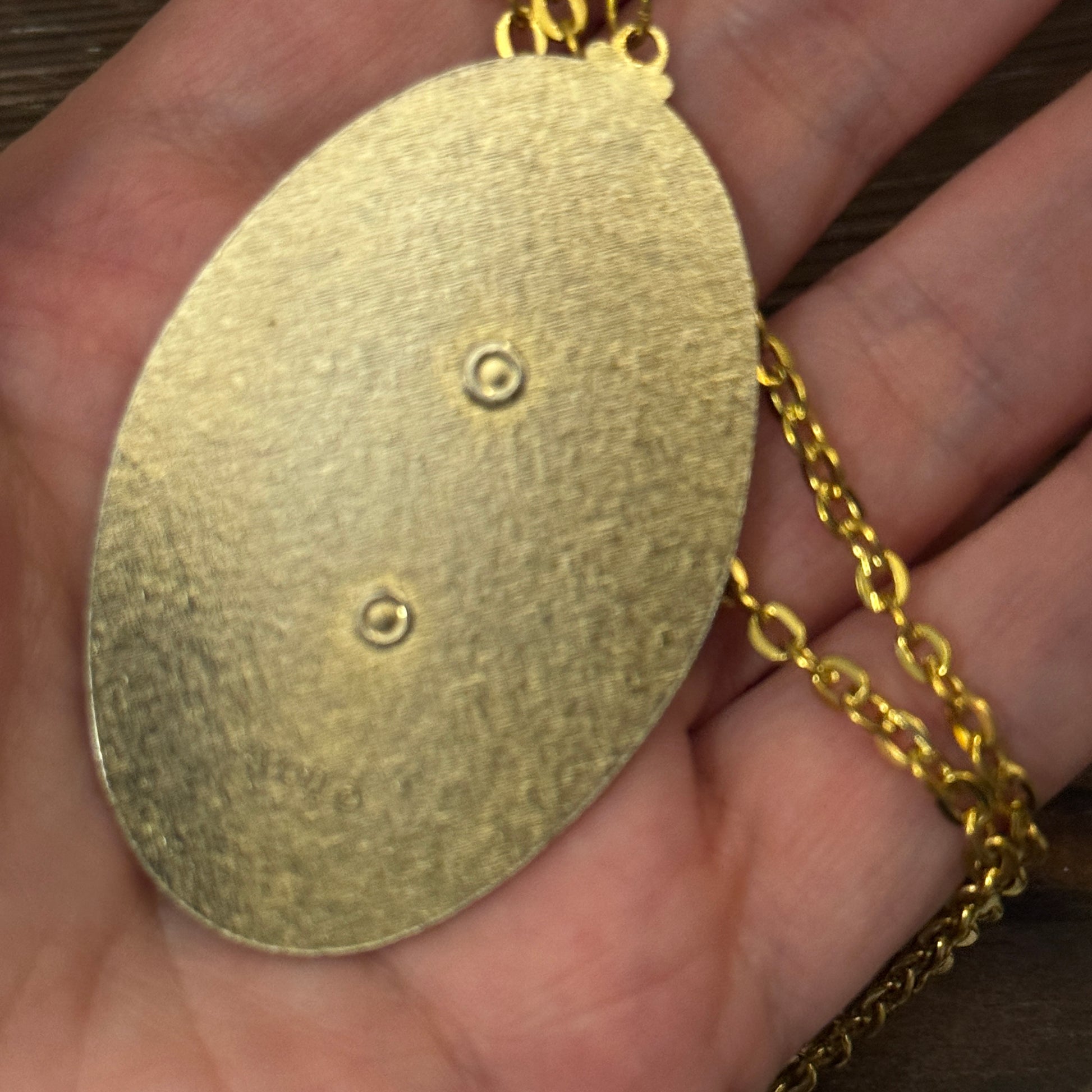 - Gold-tone oval bezel frame