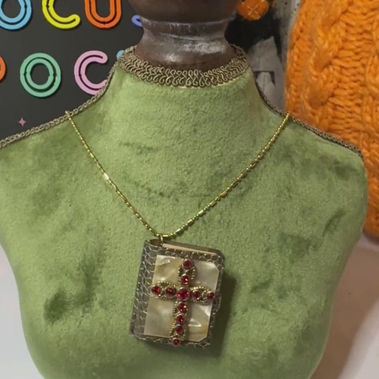 Vintage 60s Ten Commandments Book Locket Necklace Mother Pearl Cross