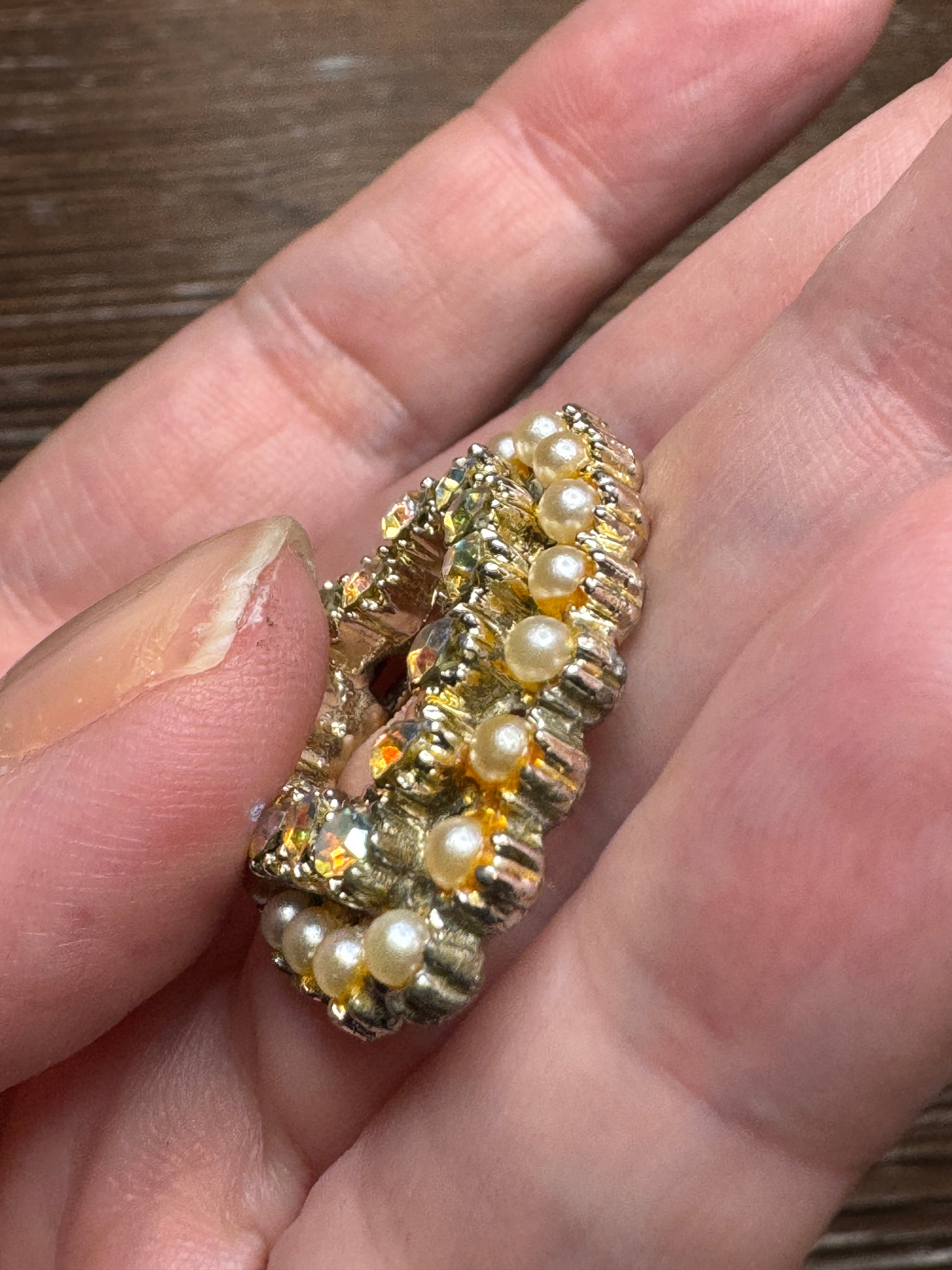 Learning Note: Aurora Borealis rhinestones were created in 1955 through a collaboration between Swarovski and Christian Dior! The special coating creates that magical rainbow flash, named after the Northern Lights. Pairing AB stones with pearls became a signature sophisticated look of the 1950s-60s. The wreath or circle design symbolized eternity and wholeness, making these pieces popular for both holiday wear and special occasions year-round. The combination of pearls' soft luster with AB rhinestones' brilliant sparkle was considered the ultimate in elegant costume jewelry!