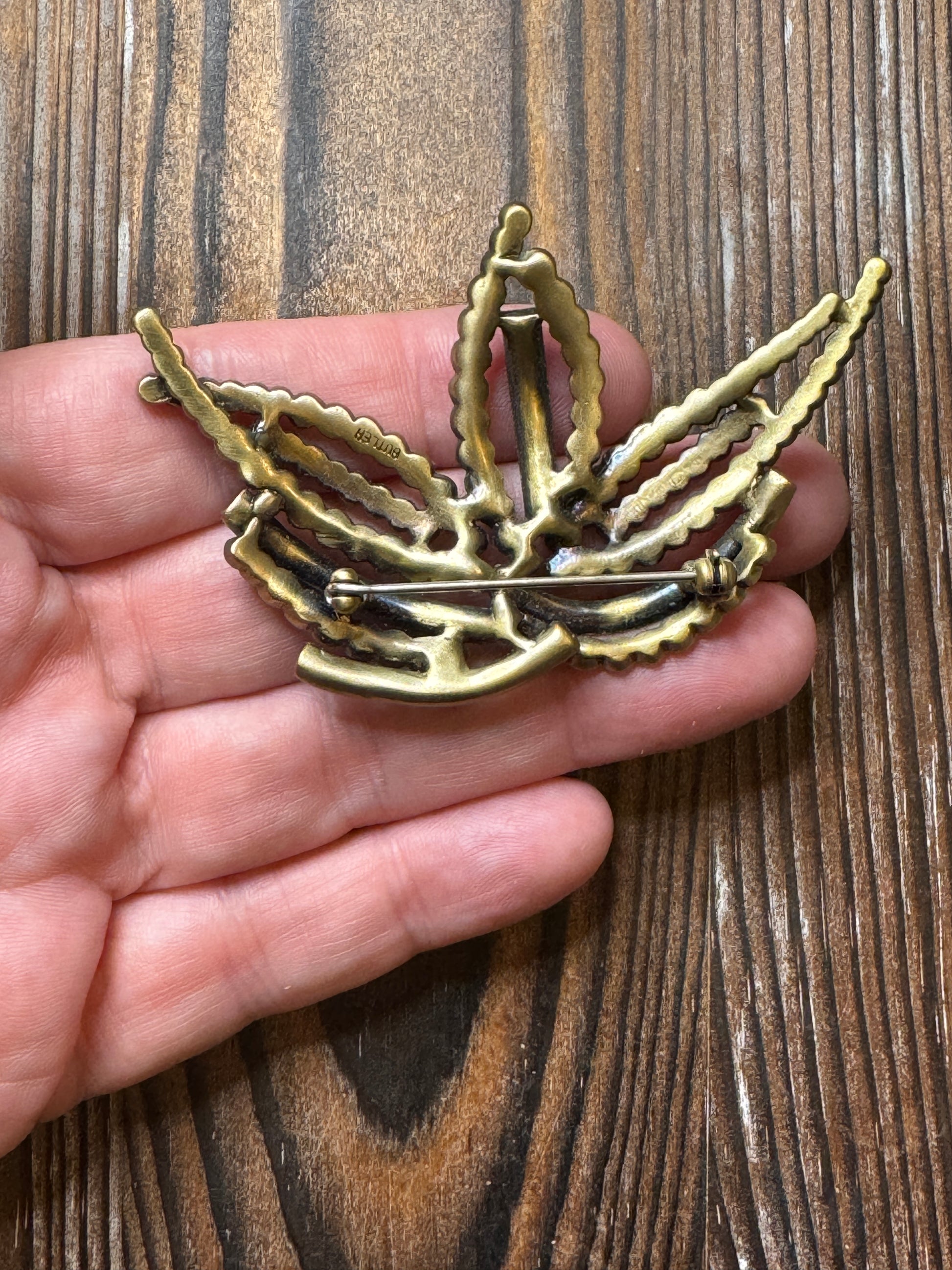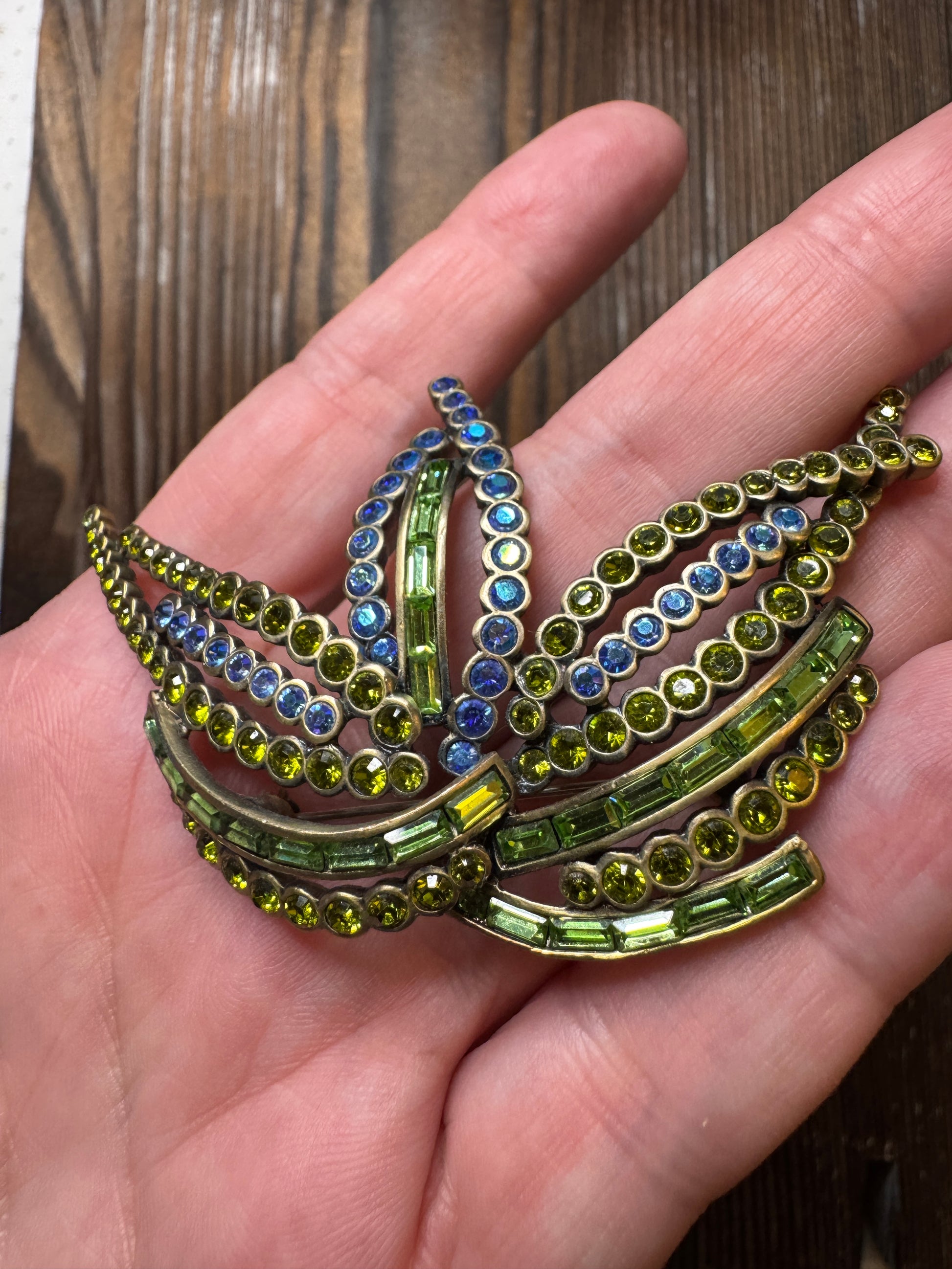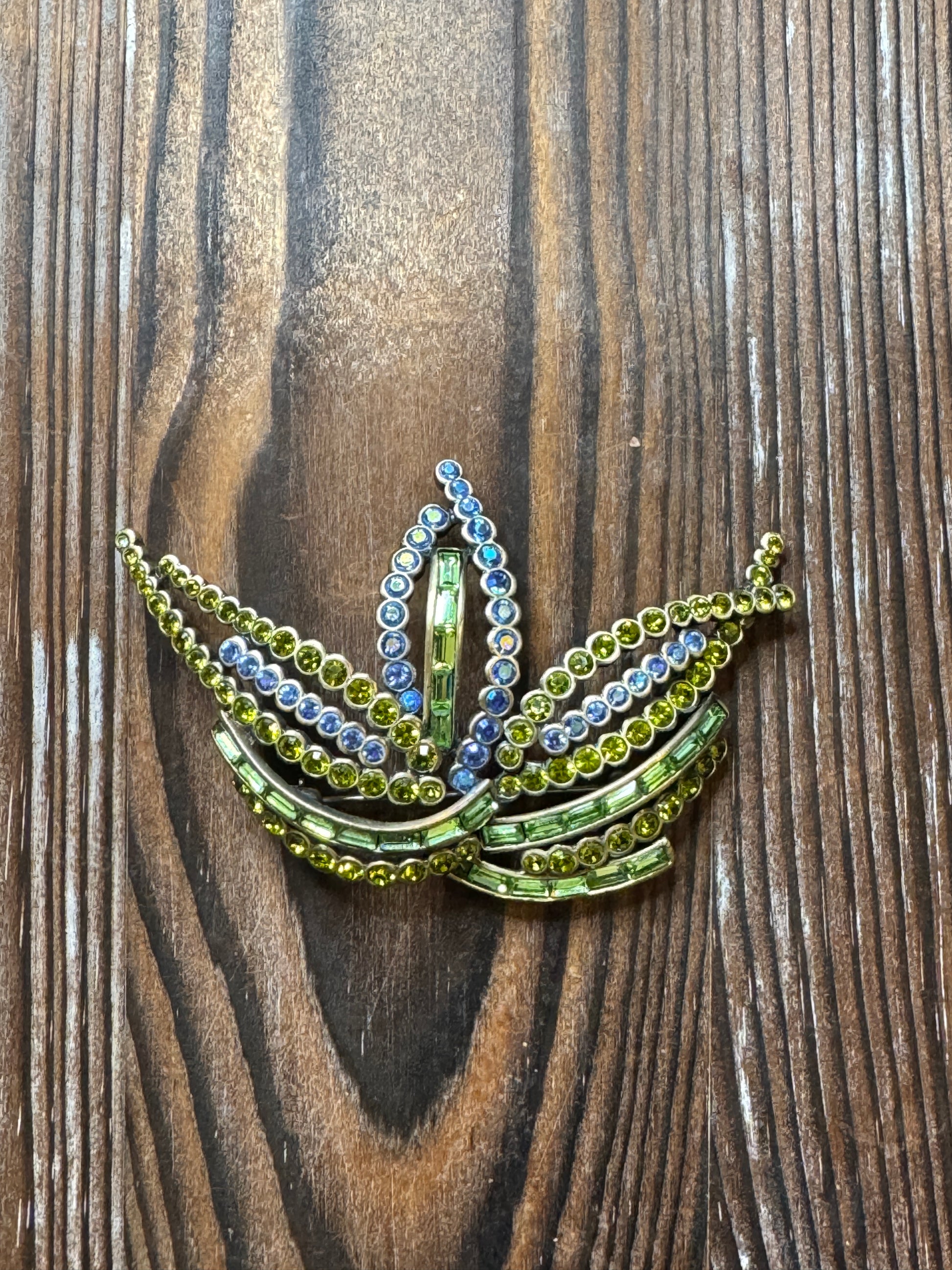 Learning Note: Butler & Wilson (founded 1969 in London) became famous for their bold, dramatic costume jewelry that mixed vintage glamour with rock-and-roll edge! However, if this is marked just "Butler," it may be from an earlier American costume jewelry maker. Crown and tiara brooches were hugely popular in the 1940s-50s when jewelry was meant to be dramatic and regal. The combination of green and blue rhinestones was considered sophisticated and fresh – breaking away from traditional red, white, and blue patriotic themes of the wartime era!