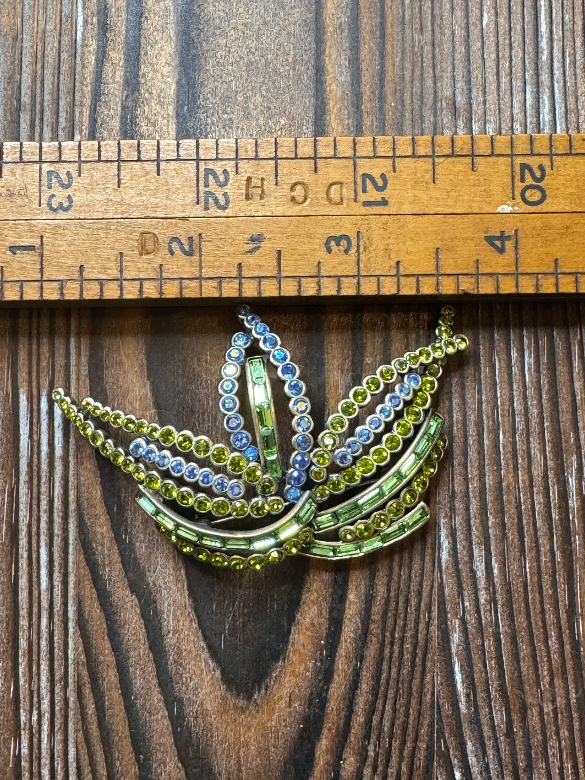 This vintage Butler brooch is absolutely regal! The crown or tiara design featuring brilliant green and blue rhinestones creates such a majestic, eye-catching look.