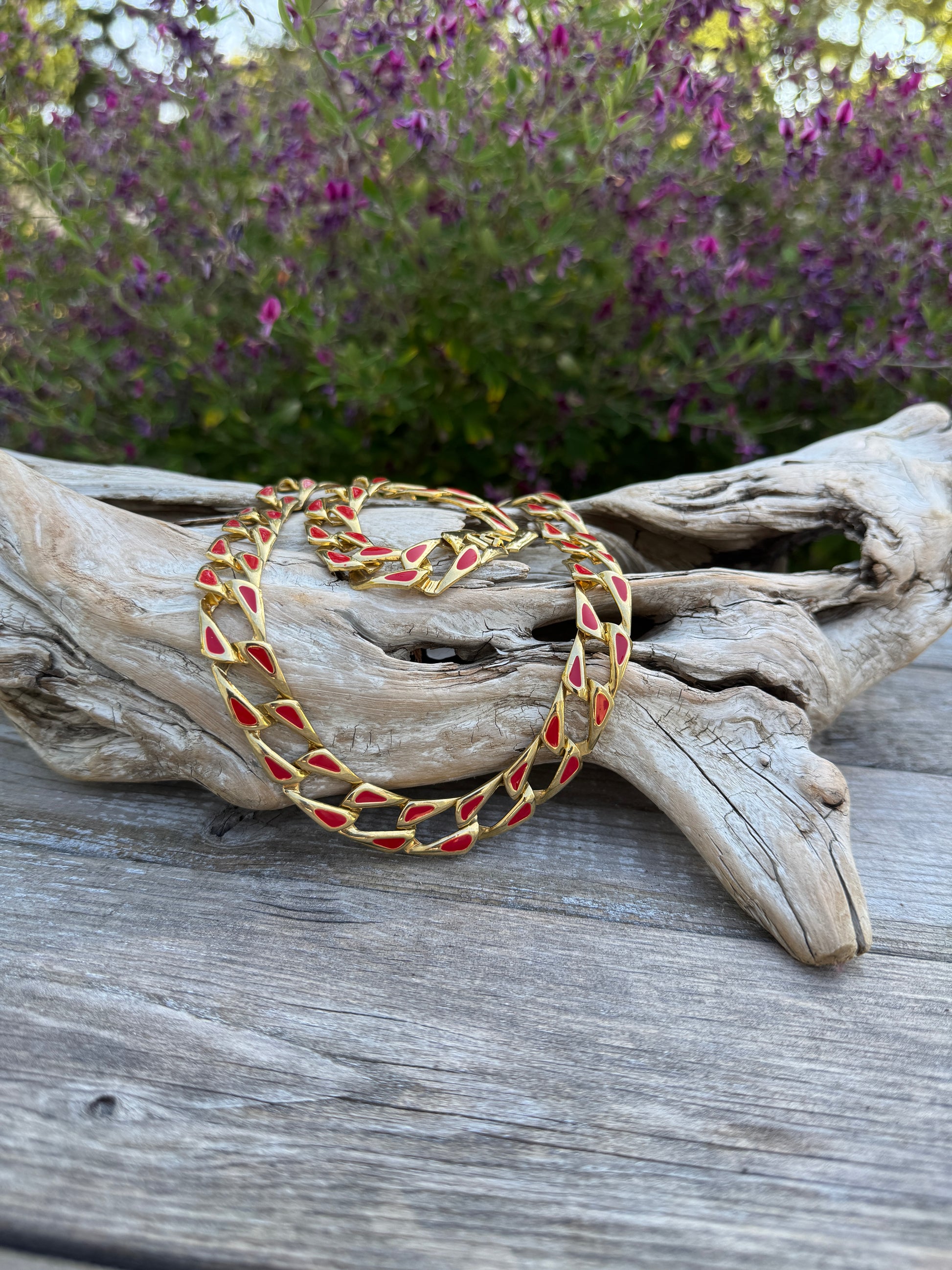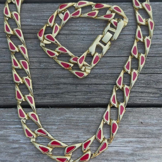 Vintage Red Enamel Gold Tone Chain Link Necklace - Designer Style Statement Jewelry