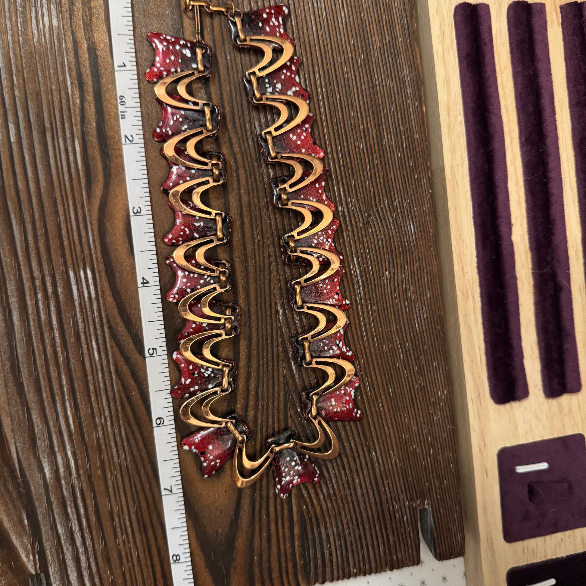 vintage copper and enamel necklace is a true statement piece! The undulating wave design with rich burgundy red enamel creates such dramatic, sculptural movement.