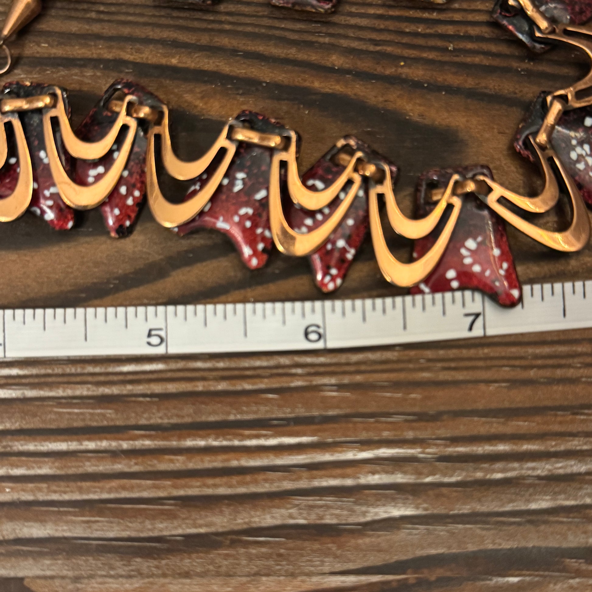 The necklace features a continuous wavy copper ribbon that flows around the neck in gorgeous organic curves. Each wave section is filled with deep burgundy red enamel speckled with white, creating wonderful texture and depth. The contrast between the warm copper borders and that rich red enamel is absolutely stunning. This is wearable art!