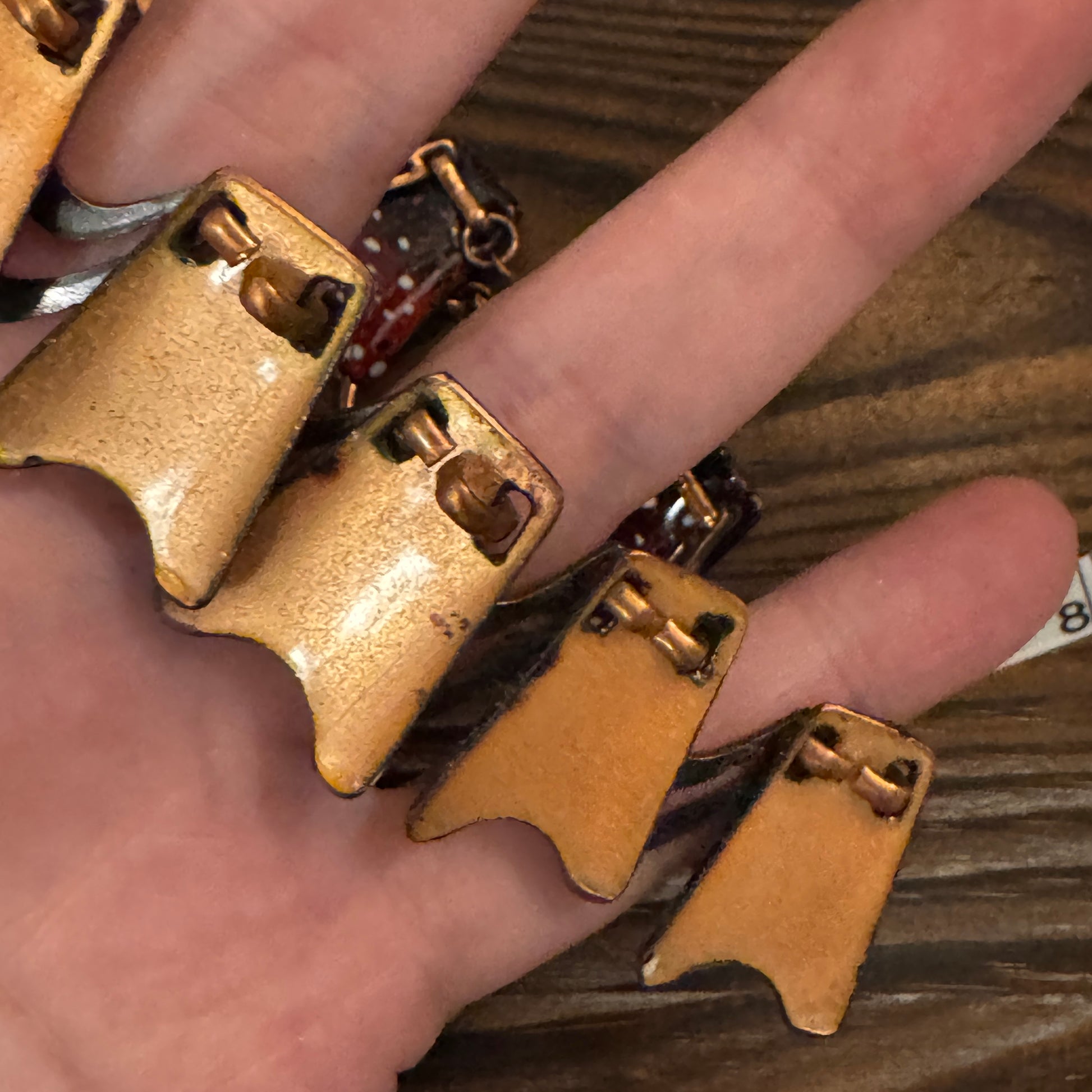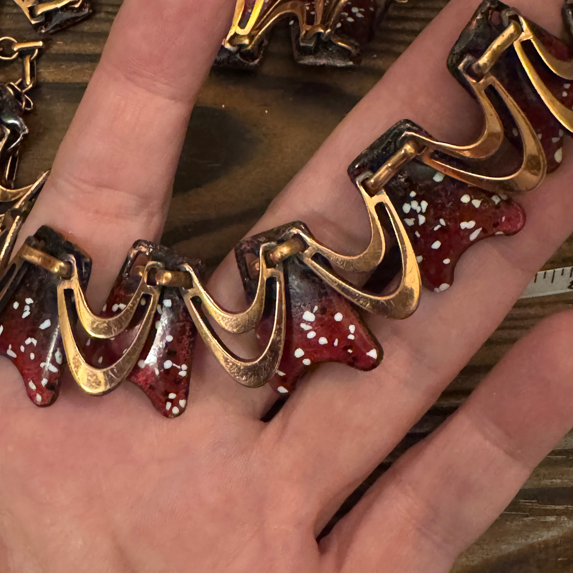 Learning Note: Copper and enamel jewelry became hugely popular during the Arts & Crafts revival of the 1960s-70s! Artisans loved working with copper because it conducted heat well for enameling and developed gorgeous patina over time. The wave or ribbon motif was a signature of modernist jewelry design, representing fluidity and organic movement. Red enamel was particularly challenging to work with as it required precise firing temperatures, making pieces like this a mark of skilled craftsmanship. Many beautiful copper enamel pieces were created by studio artists and sold at craft fairs!