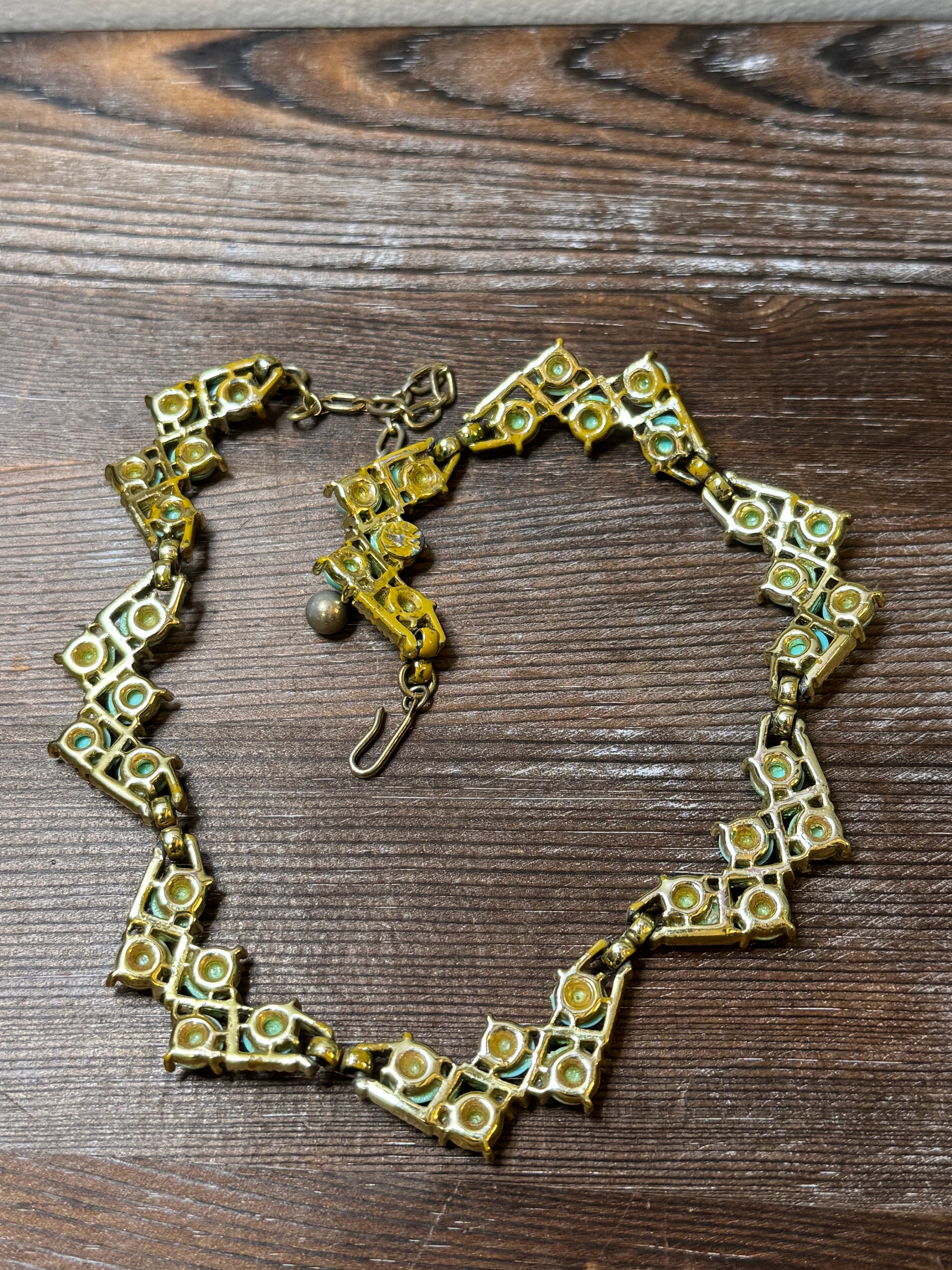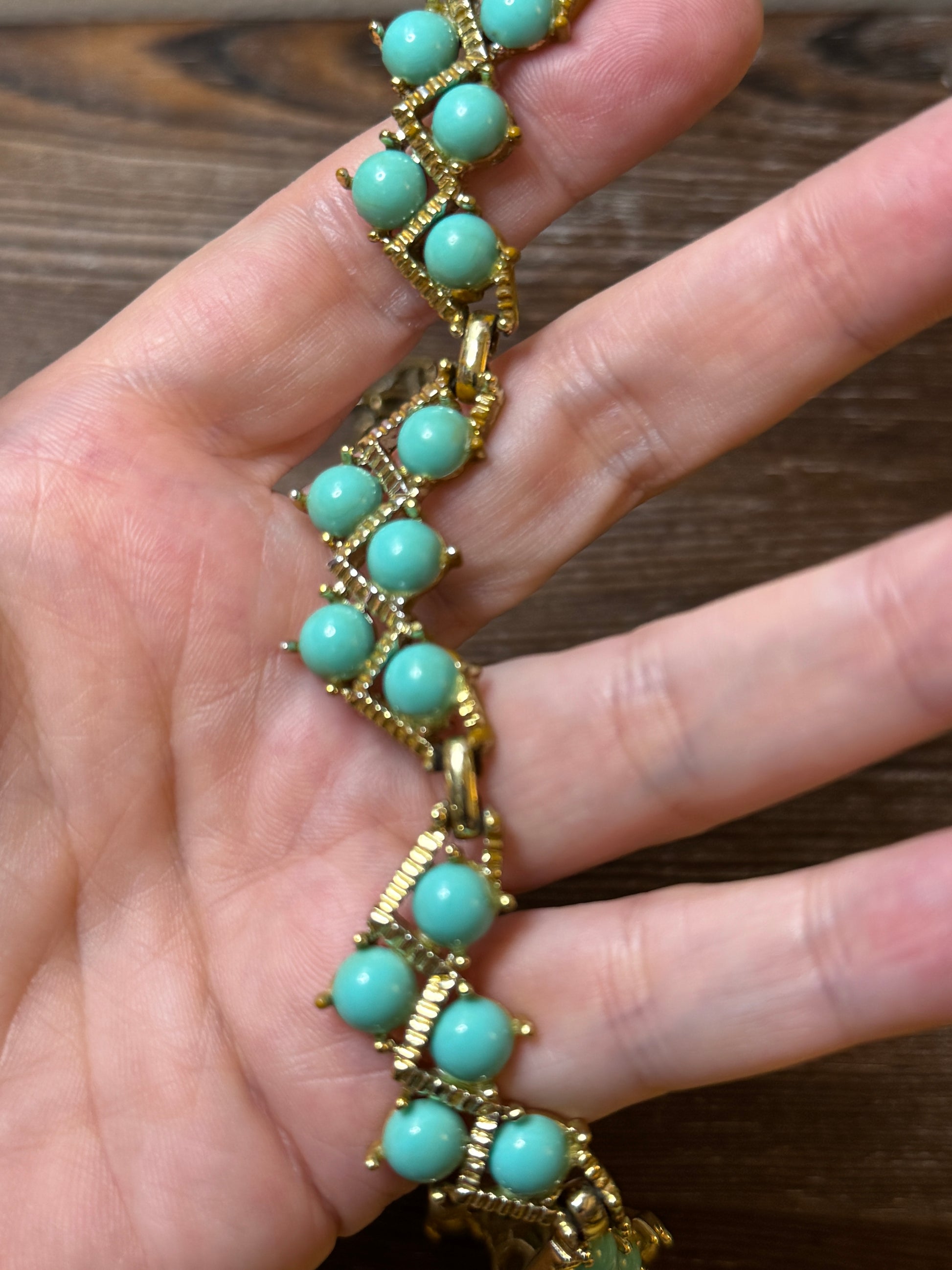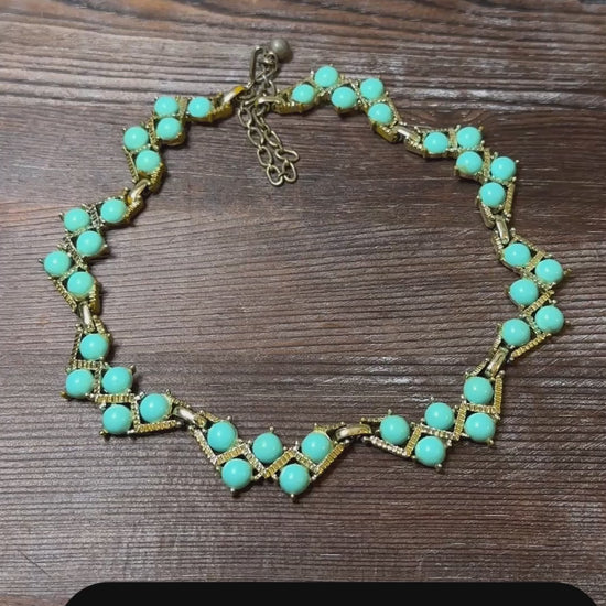 Vintage unsigned necklace featuring turquoise-colored plastic beads set in gold-tone linked frames. Mid-century design with adjustable hook clasp. Lightweight, bright, and ideal for layering.