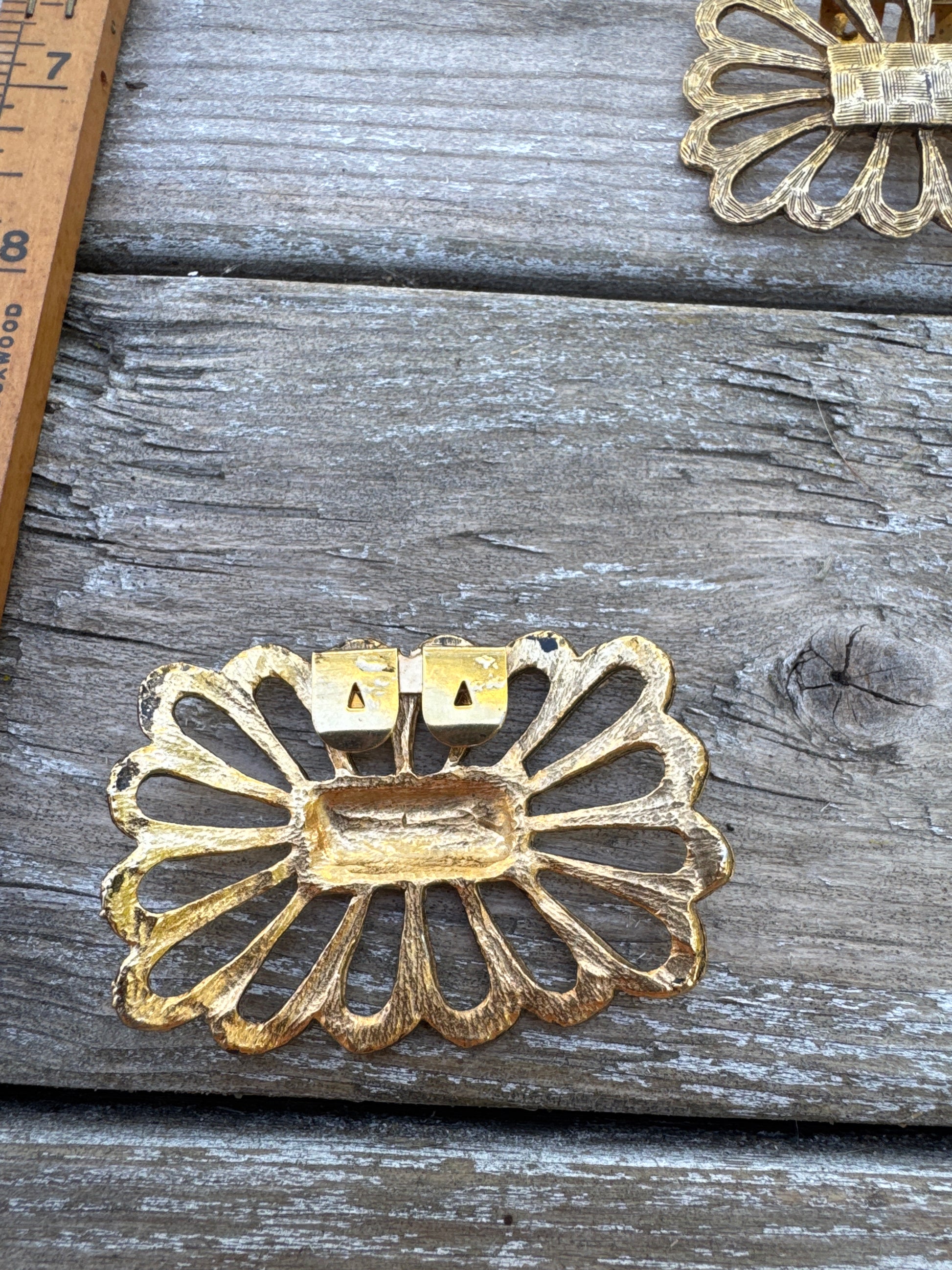 Oh honey, these are DIVINE! Step back in time with this absolutely exquisite pair of vintage gold tone shoe clips that are screaming old Hollywood glamour! The intricate filigree work is just chef's kiss - every tiny detail has been carefully crafted to create these stunning openwork designs that catch the light from every angle. These babies are giving us major 1930s-40s vibes with that classic Art Deco style geometric pattern. Perfect for adding instant vintage elegance to any pair of shoes - from pumps to flats to even sneakers if you're feeling adventurous! We love how these can completely transform an outfit from basic to absolutely breathtaking. The substantial construction means these beauties will stay securely on your shoes while you dance the night away in vintage style!