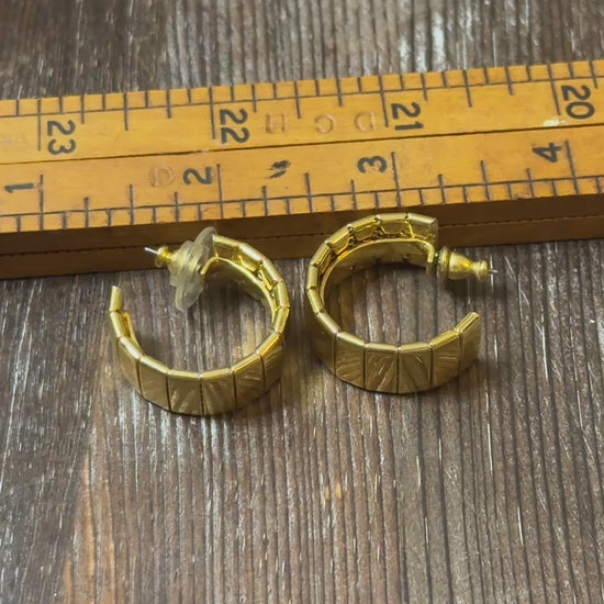 These segmented gold-tone hoops date from the late 1970s to early 1990s. The design mirrors the look of a watch band, with articulated rectangular links arranged in a curved half-hoop shape.