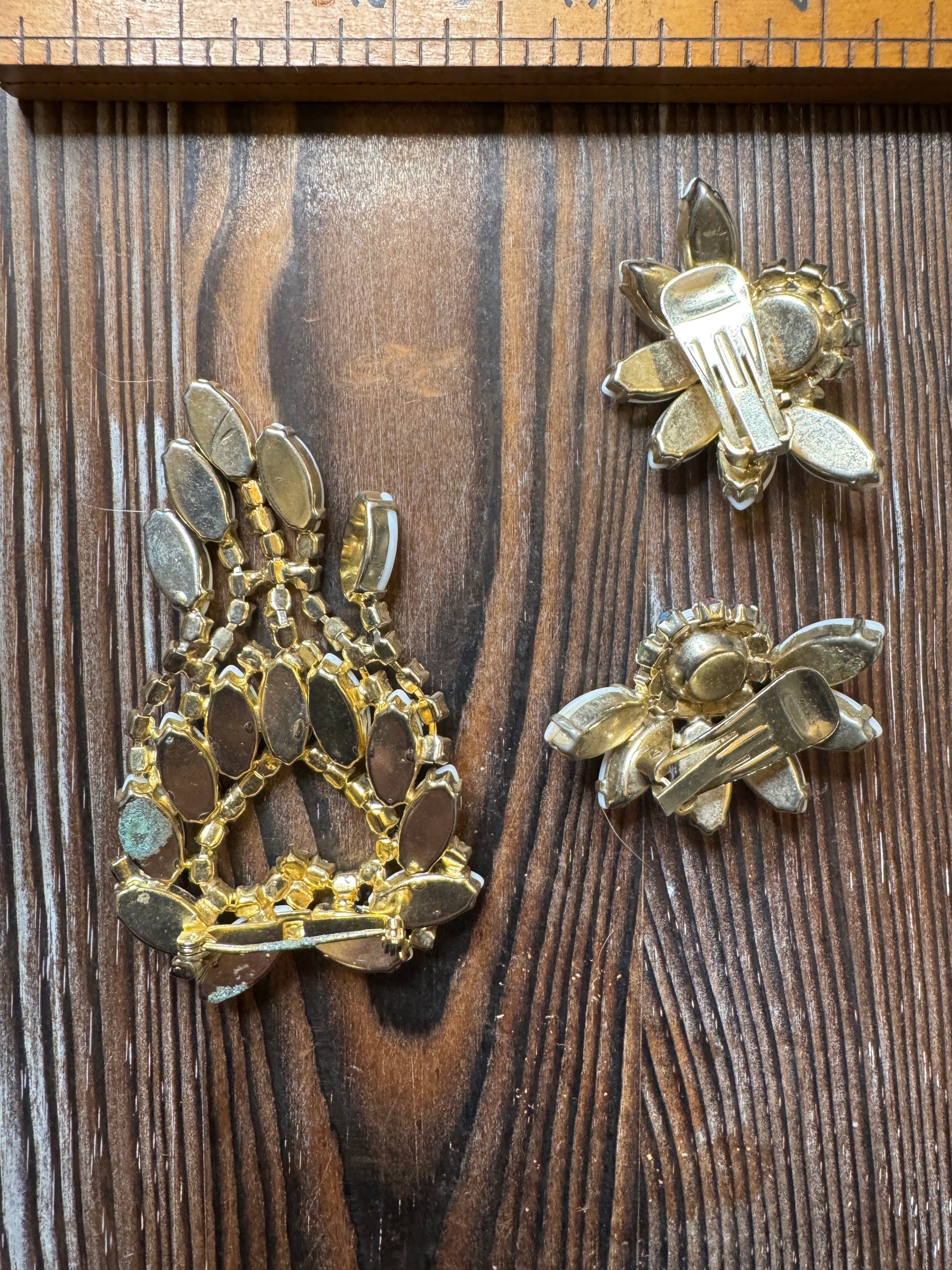 Learning Note: Aurora Borealis rhinestones were created in 1955 through a collaboration between Swarovski and Christian Dior! The special coating creates that magical rainbow flash, named after the Northern Lights. Pairing AB stones with milk glass became a signature look of high-end 1950s-60s costume jewelry because the contrast between the matte white glass and brilliant rainbow sparkle was absolutely showstopping. These elaborate parure sets (matching brooch and earrings) were considered essential for elegant evening wear and special occasions!