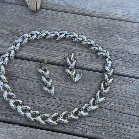 This vintage set includes a silver toned 16 inch collar and spring loaded clip earrings, adding a touch of elegance to any outfit. Crafted with quality materials, this necklace and earring set are timeless pieces that will elevate your style. Perfect for special occasions or everyday wear.
