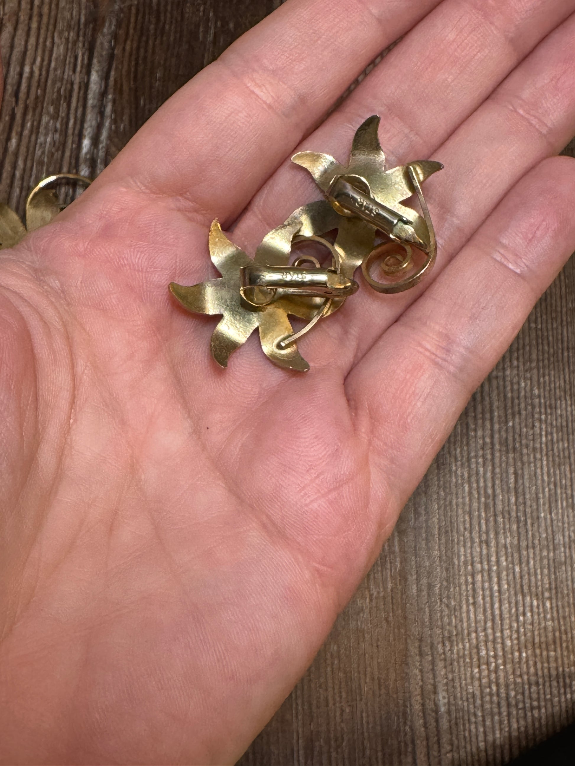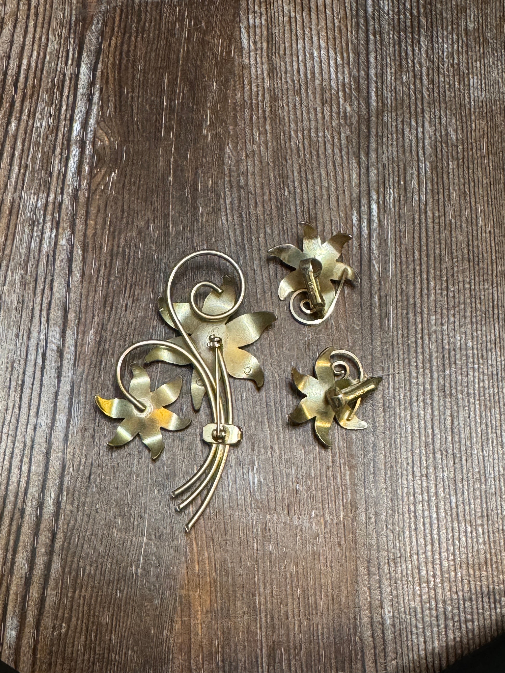 This mid-century STAR jewelry set features a coordinating floral motif with textured gold-tone petals and small faux pearl centers. The brooch has two blossoms bound by a sculptural gold stem, while the clip earrings echo the same five-petal flower design with graceful curled tendrils.
